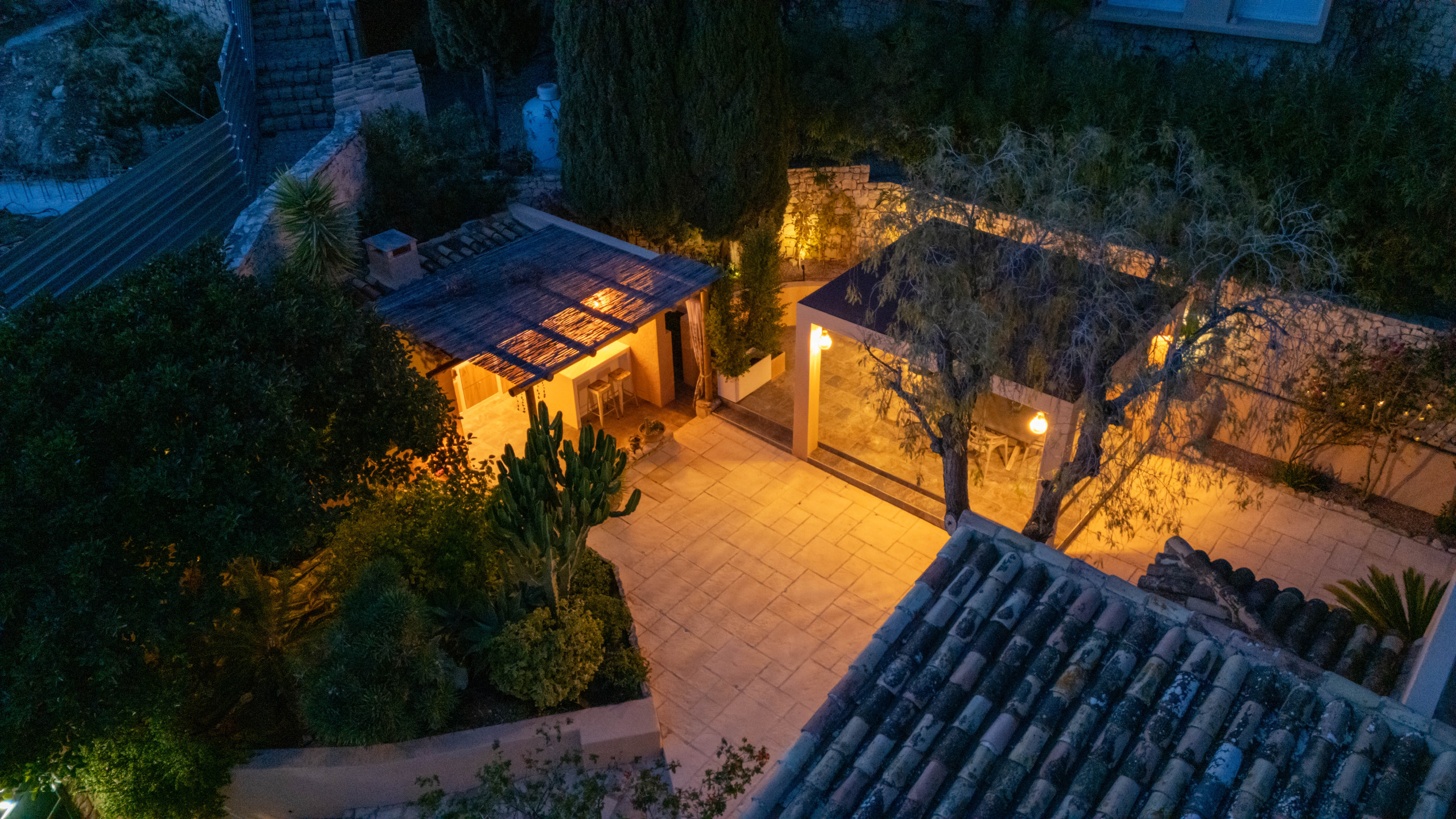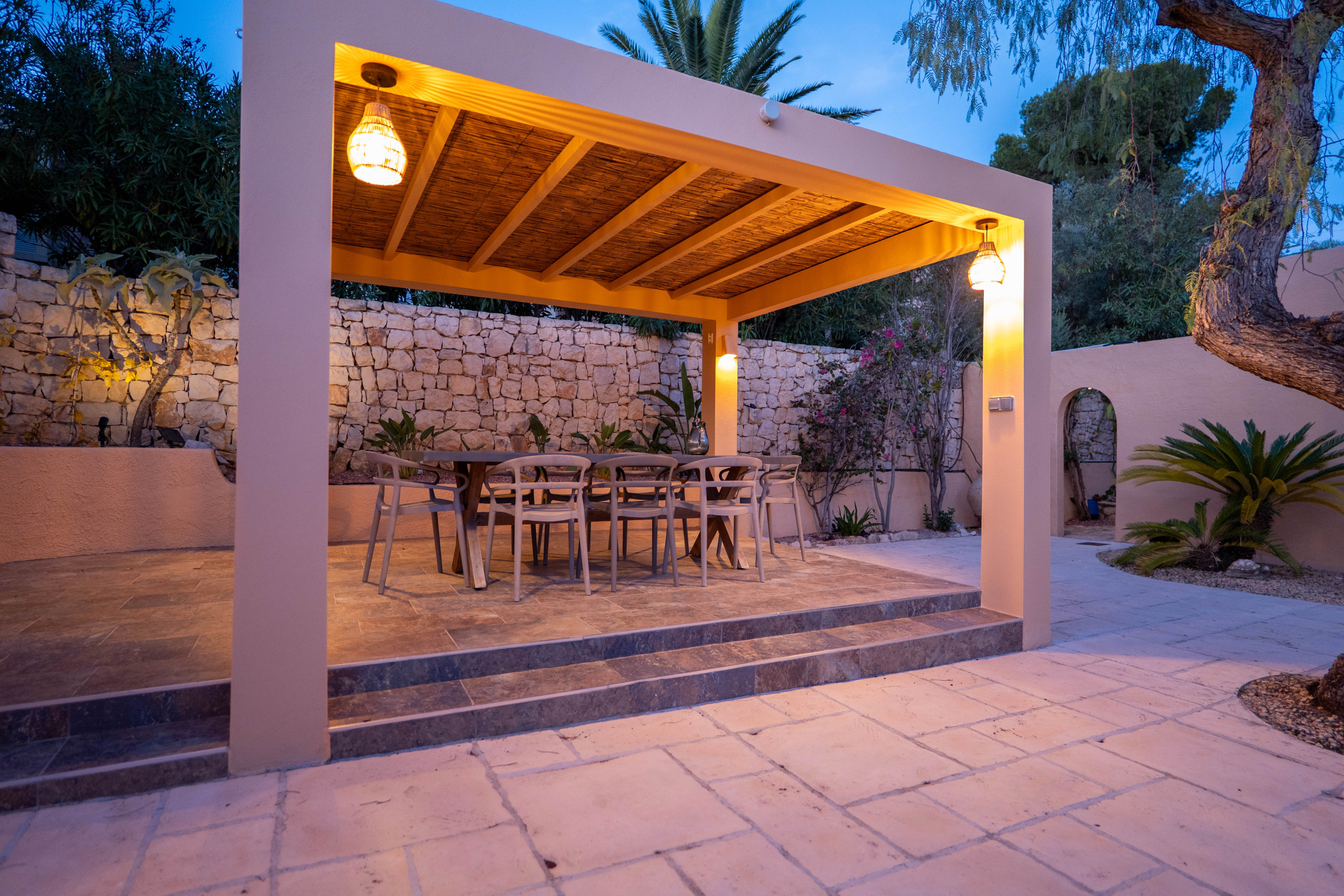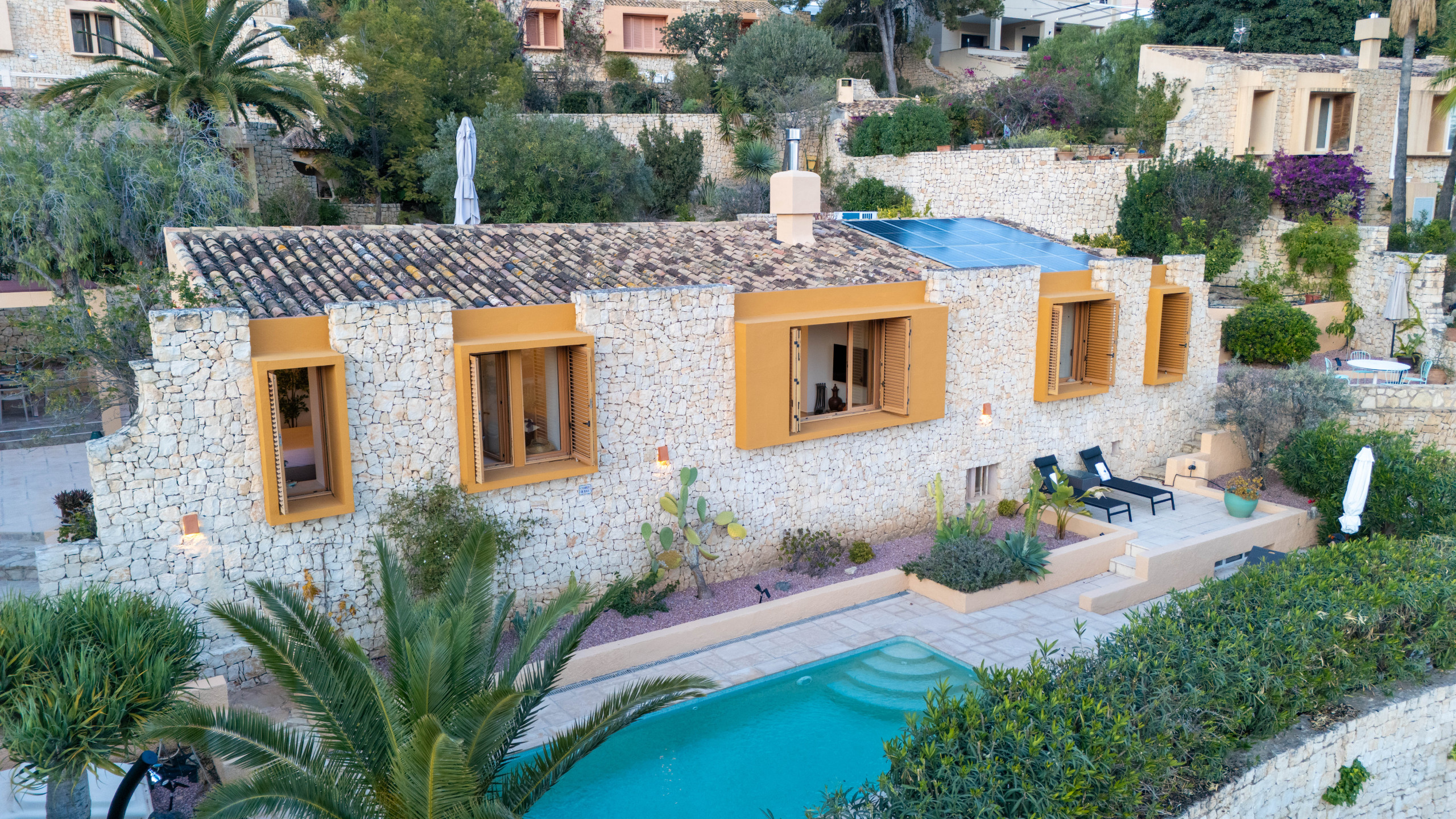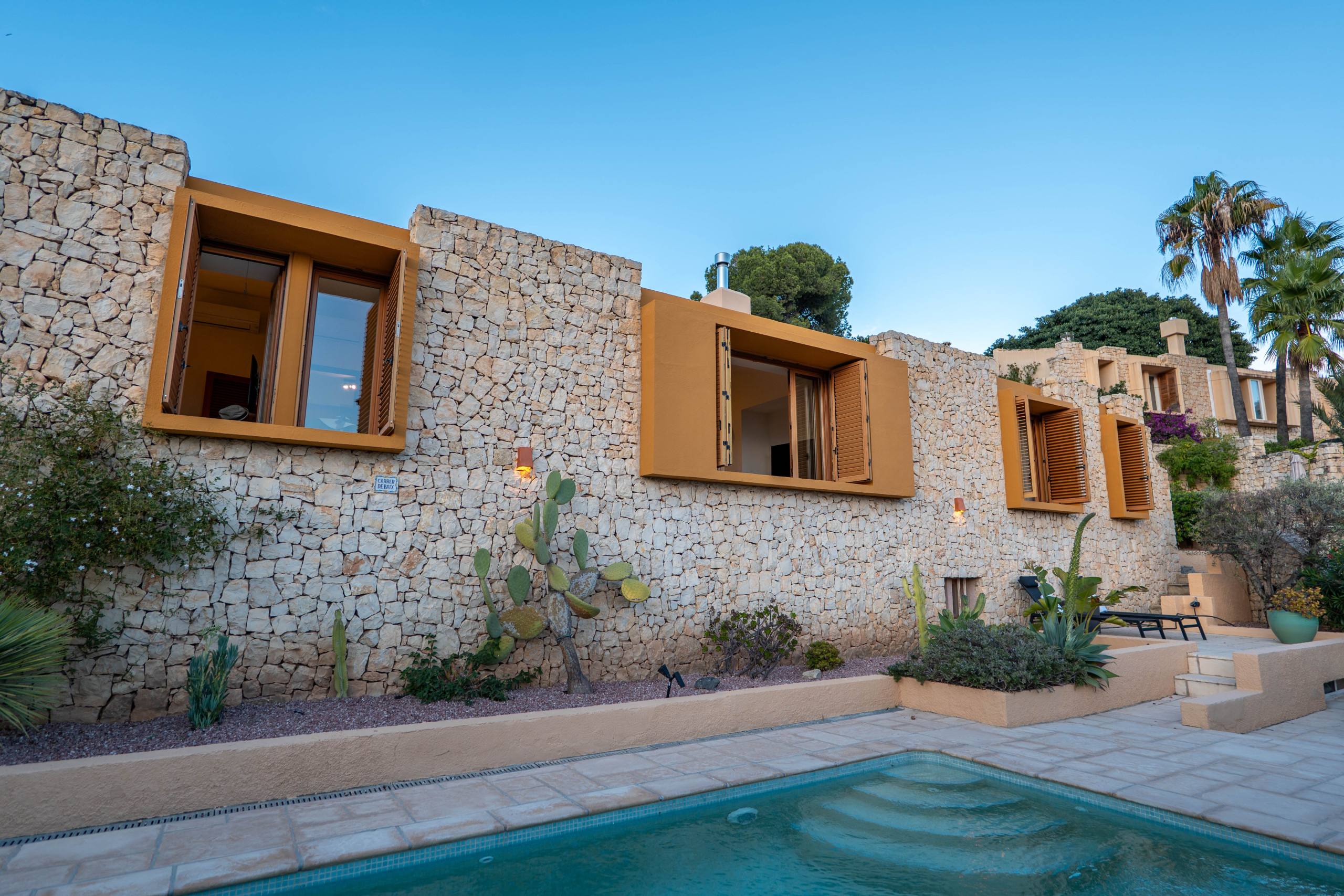 El Exterior: Tu mirador privado al Mediterráneo La vida en esta villa gira en torno a su fabuloso espacio exterior. Rodeada de vegetación y con total privacidad, la zona de piscina se convierte en el corazón de la casa. Disfruta de cenas inolvidables bajo la pérgola techada, equipada con una zona de barbacoa completa (plancha a gas, nevera y barra), mientras contemplas las icónicas siluetas de La Muralla Roja y el Xanadú, catalogados como Bien de Interés Cultural.