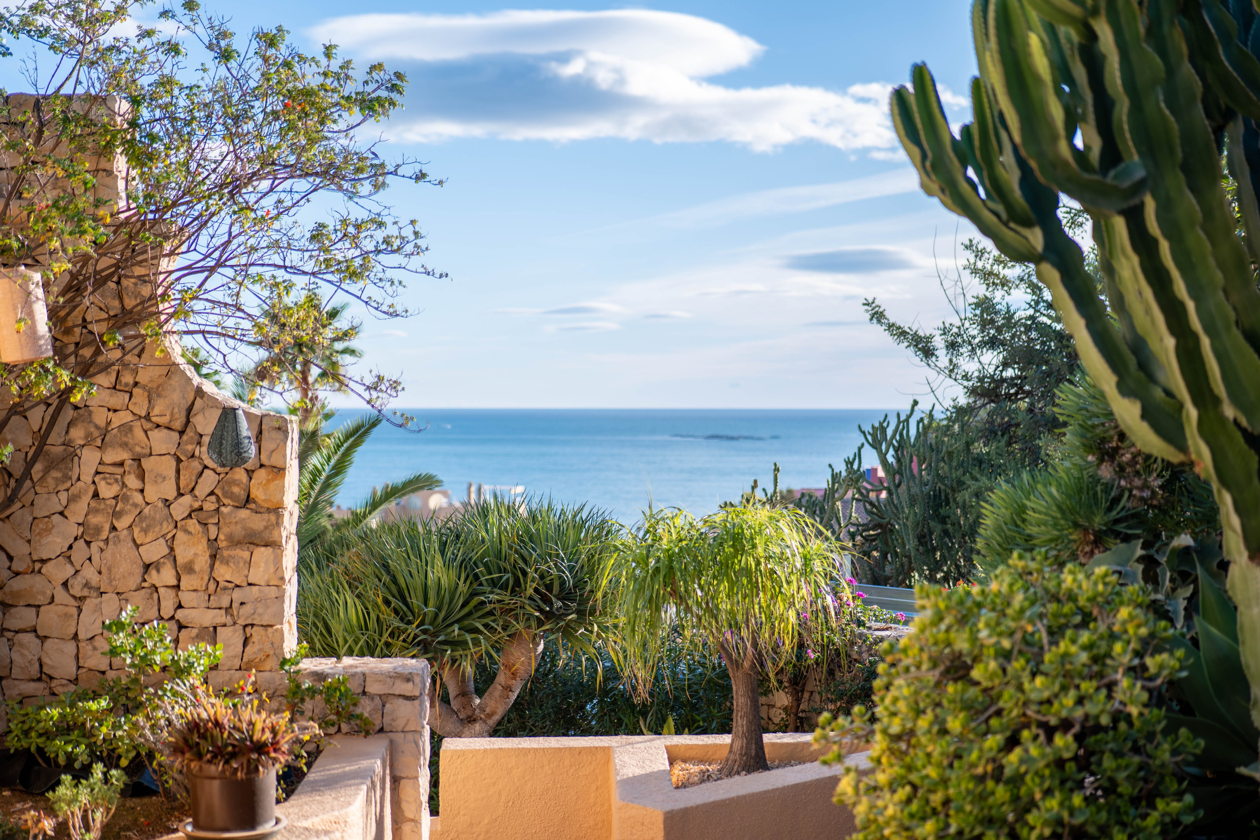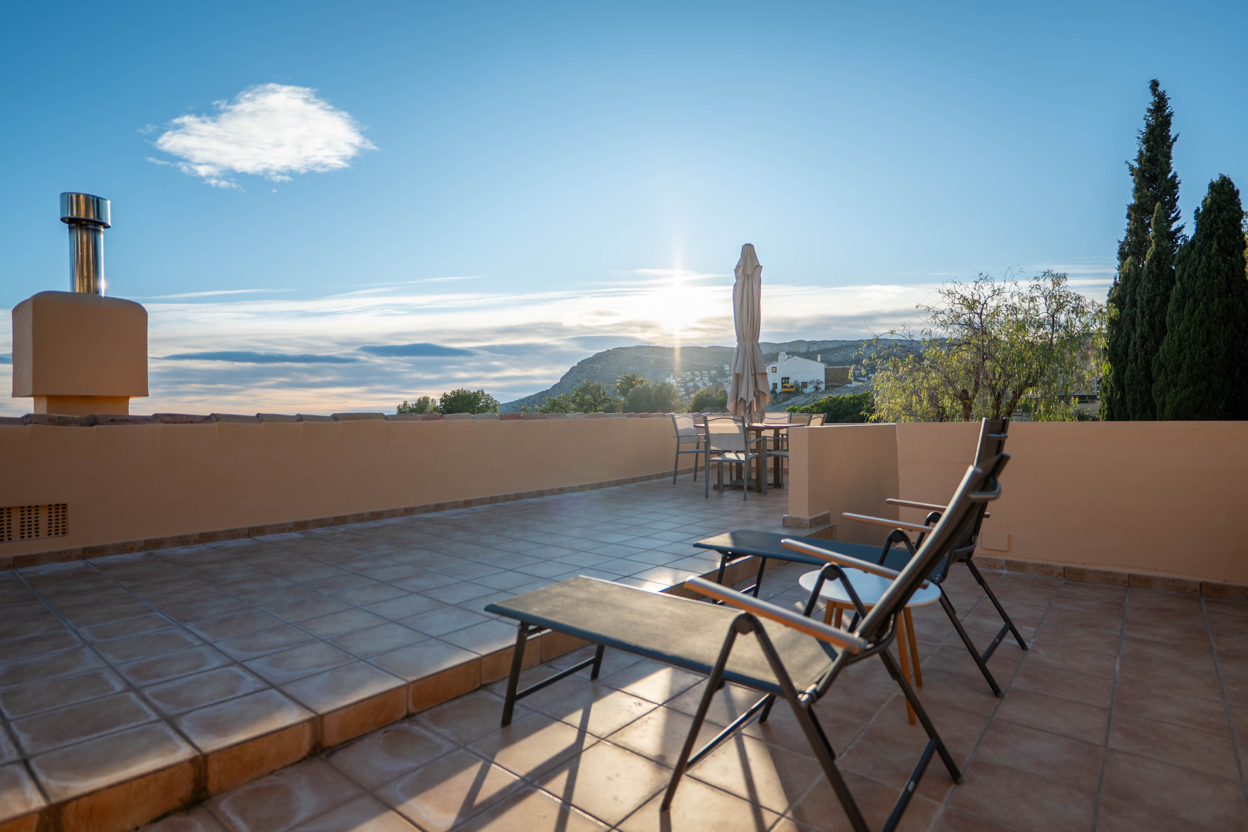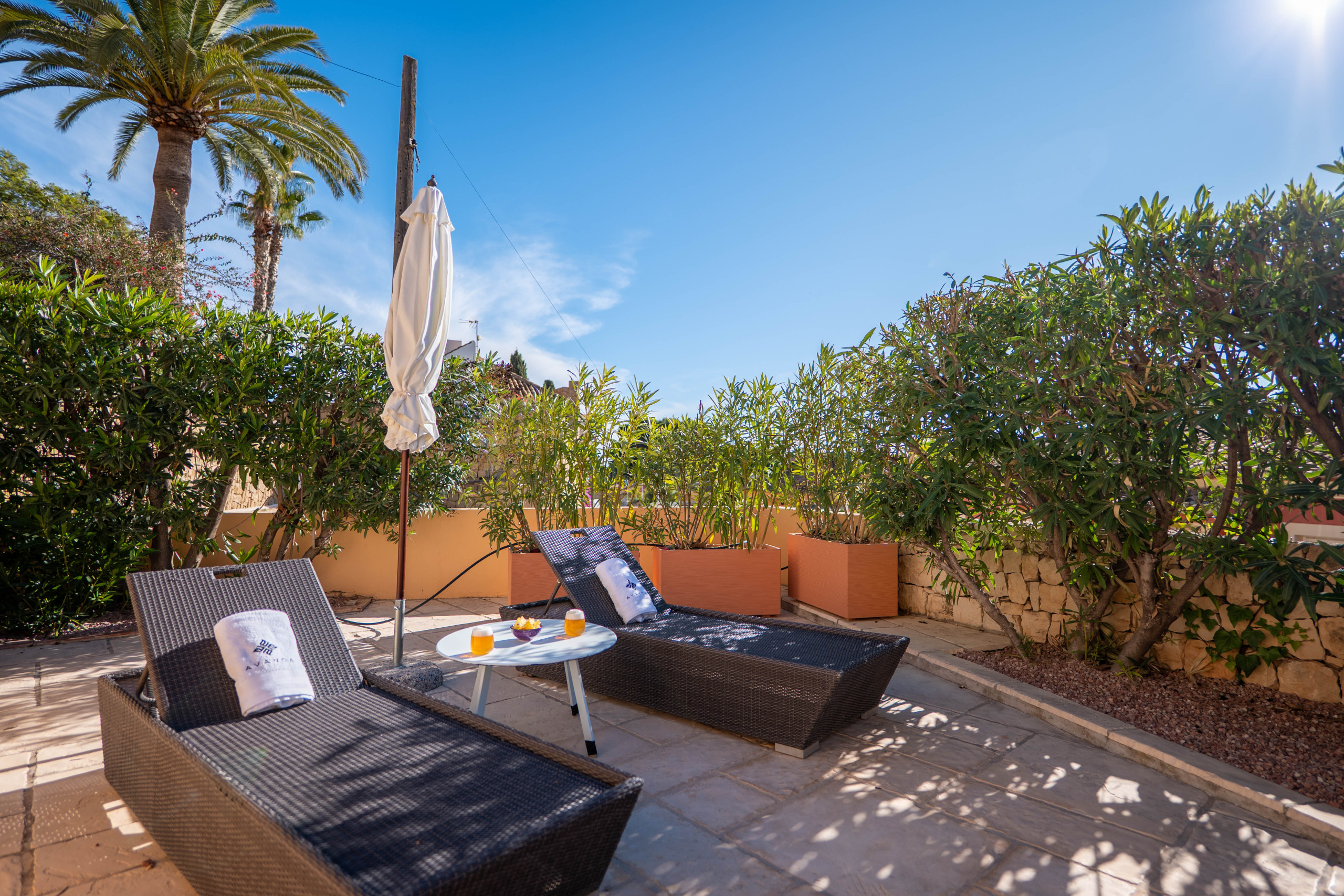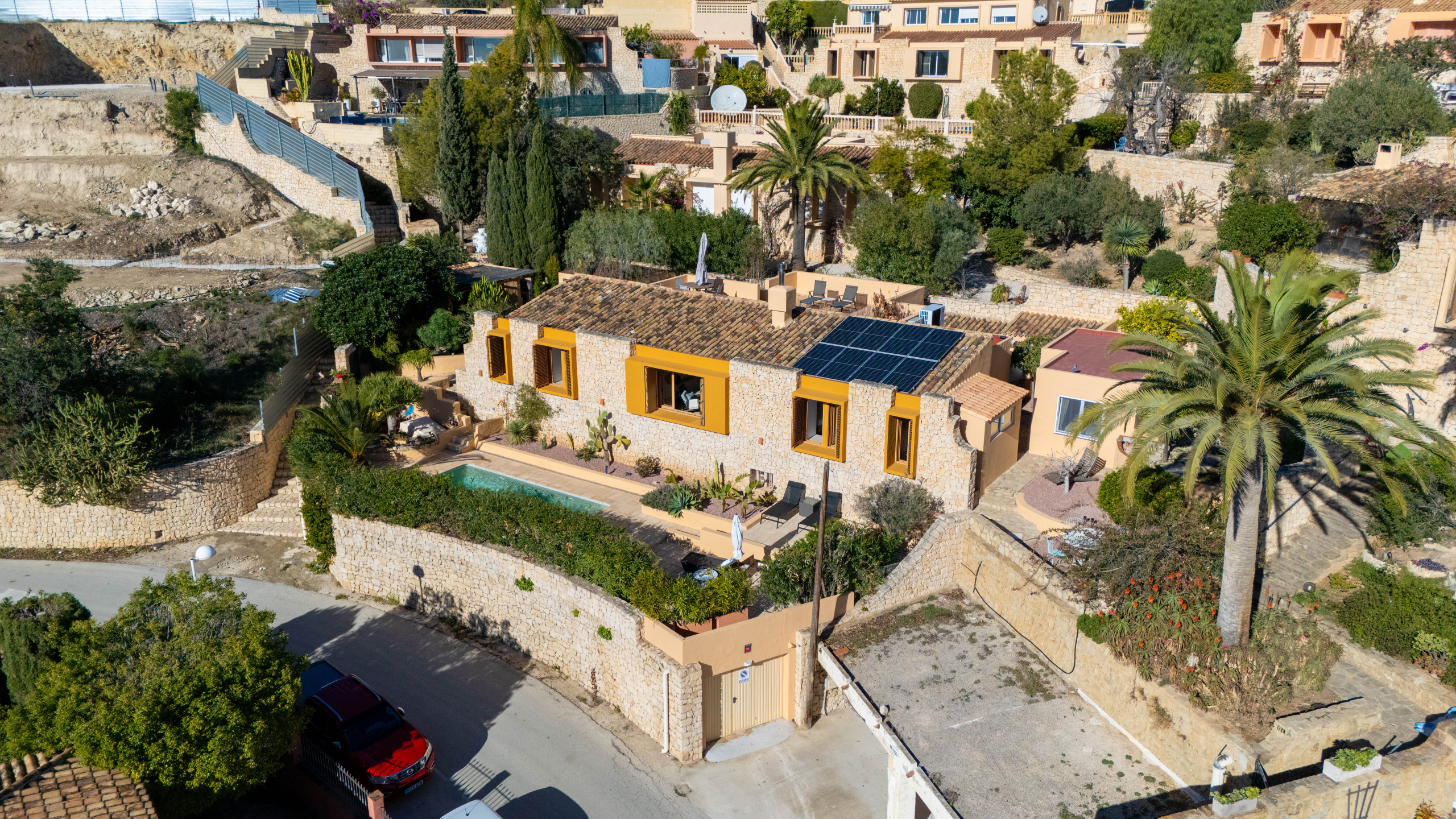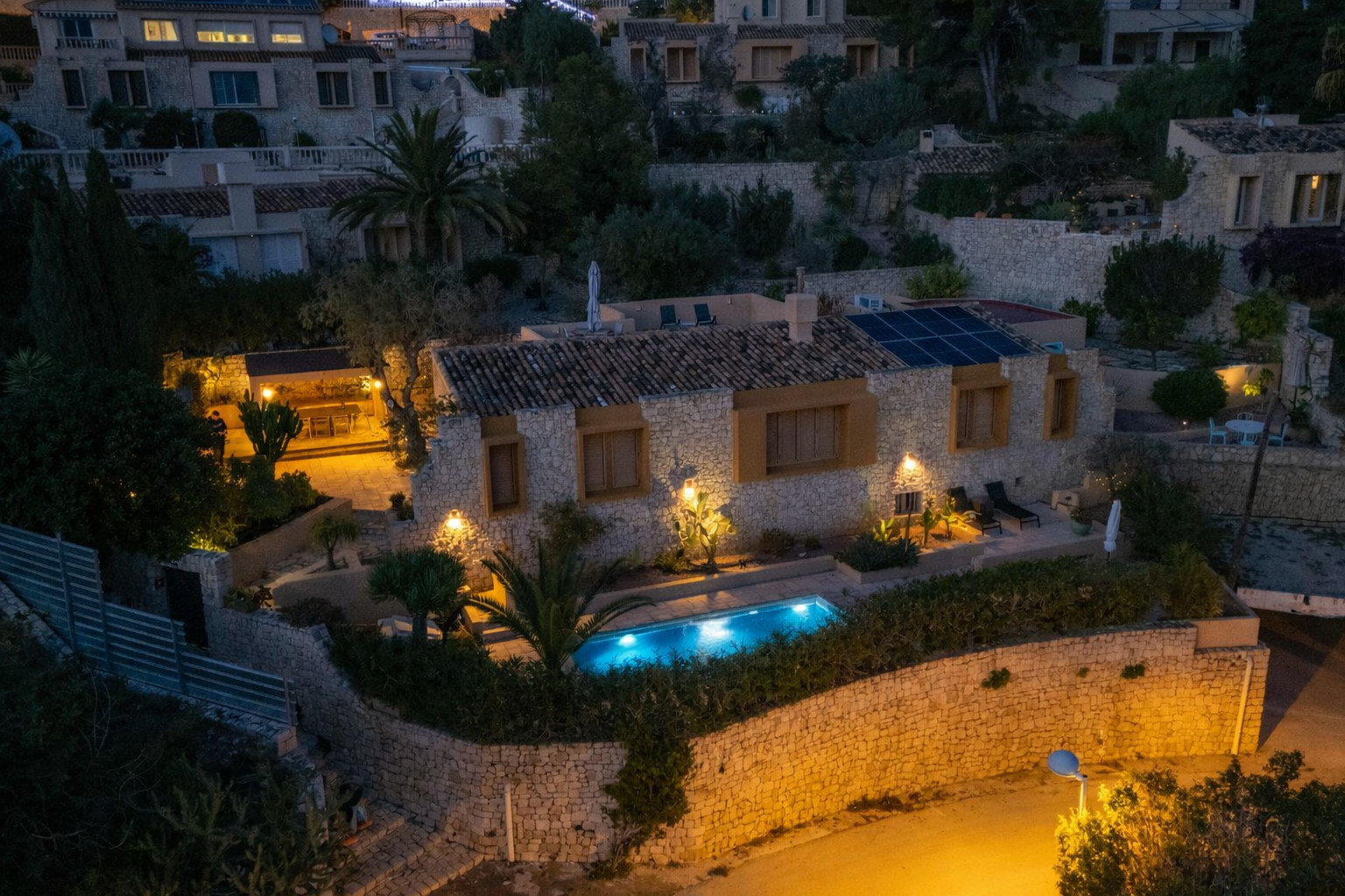 El Exterior: Tu mirador privado al Mediterráneo La vida en esta villa gira en torno a su fabuloso espacio exterior. Rodeada de vegetación y con total privacidad, la zona de piscina se convierte en el corazón de la casa. Disfruta de cenas inolvidables bajo la pérgola techada, equipada con una zona de barbacoa completa (plancha a gas, nevera y barra), mientras contemplas las icónicas siluetas de La Muralla Roja y el Xanadú, catalogados como Bien de Interés Cultural.