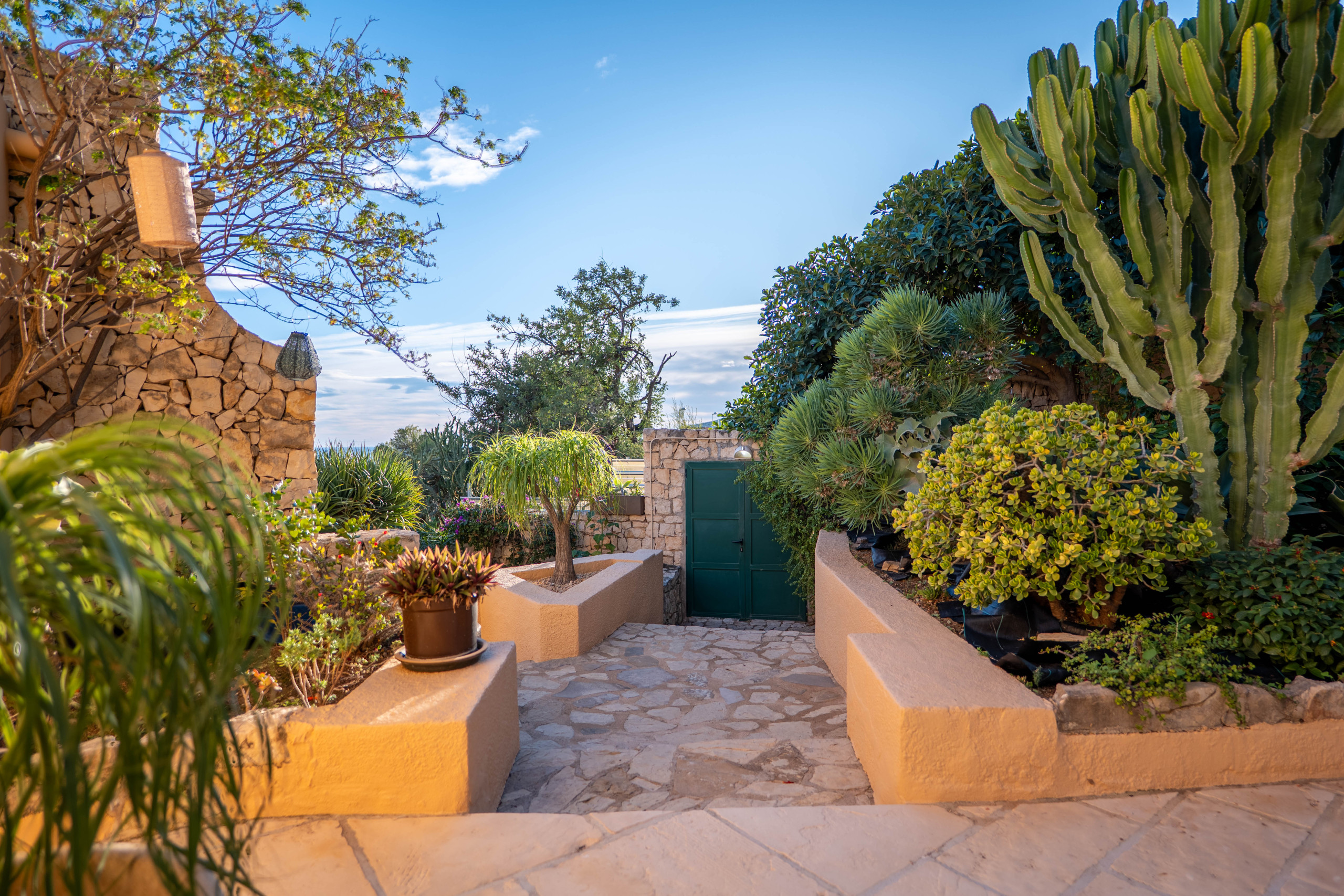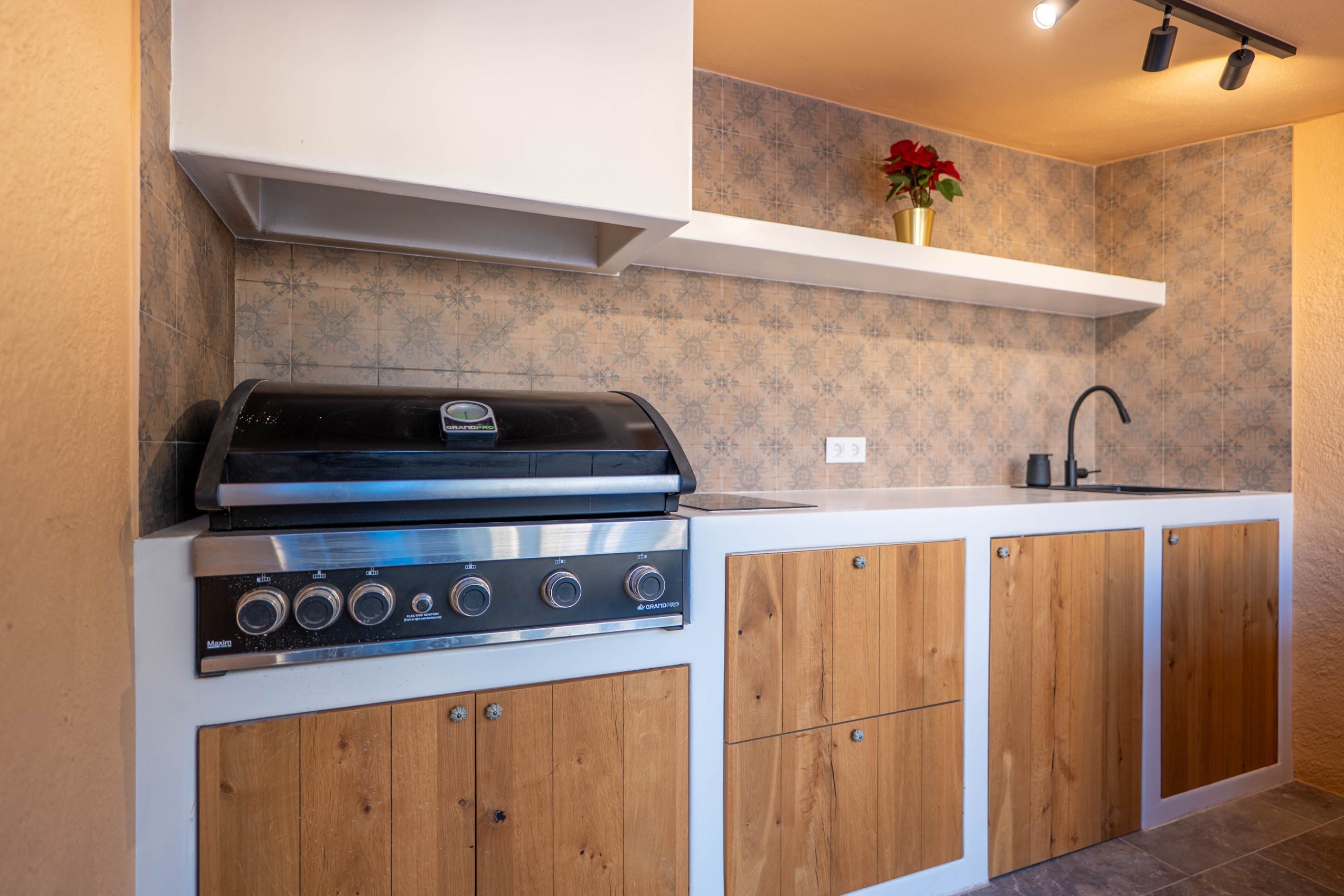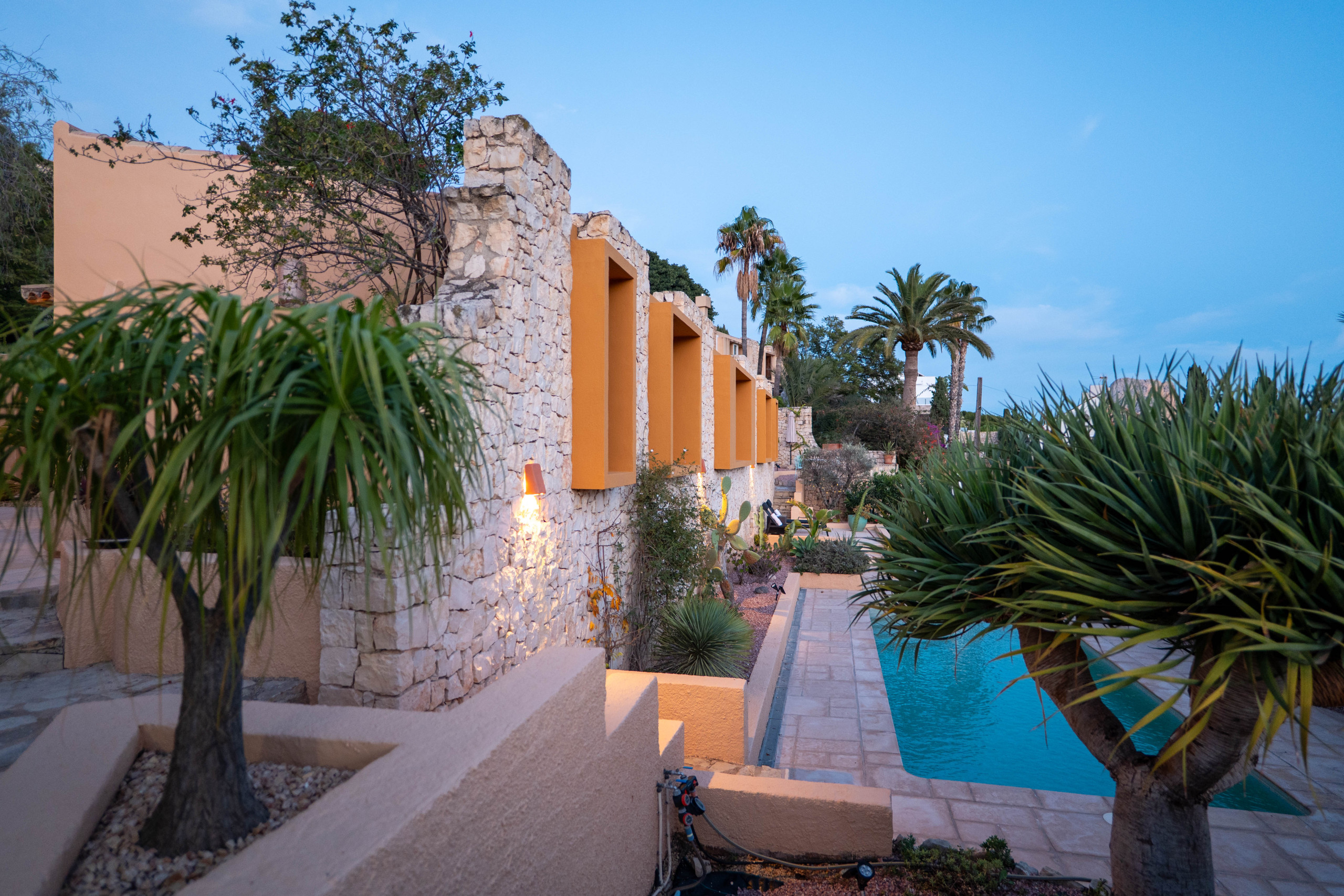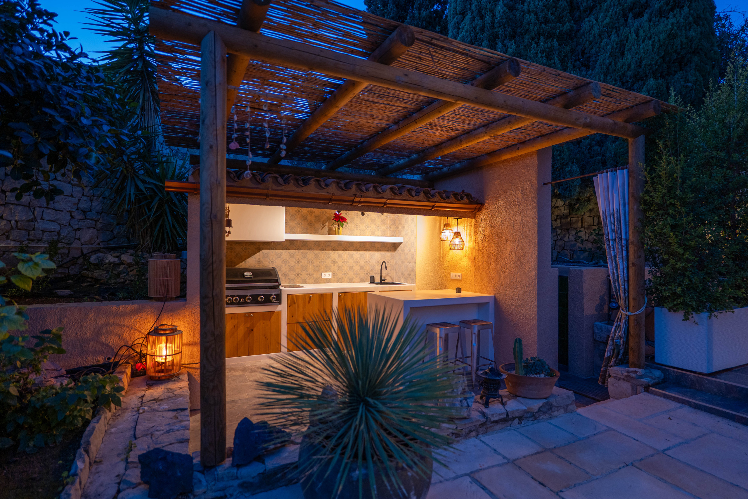 El Exterior: Tu mirador privado al Mediterráneo La vida en esta villa gira en torno a su fabuloso espacio exterior. Rodeada de vegetación y con total privacidad, la zona de piscina se convierte en el corazón de la casa. Disfruta de cenas inolvidables bajo la pérgola techada, equipada con una zona de barbacoa completa (plancha a gas, nevera y barra), mientras contemplas las icónicas siluetas de La Muralla Roja y el Xanadú, catalogados como Bien de Interés Cultural.