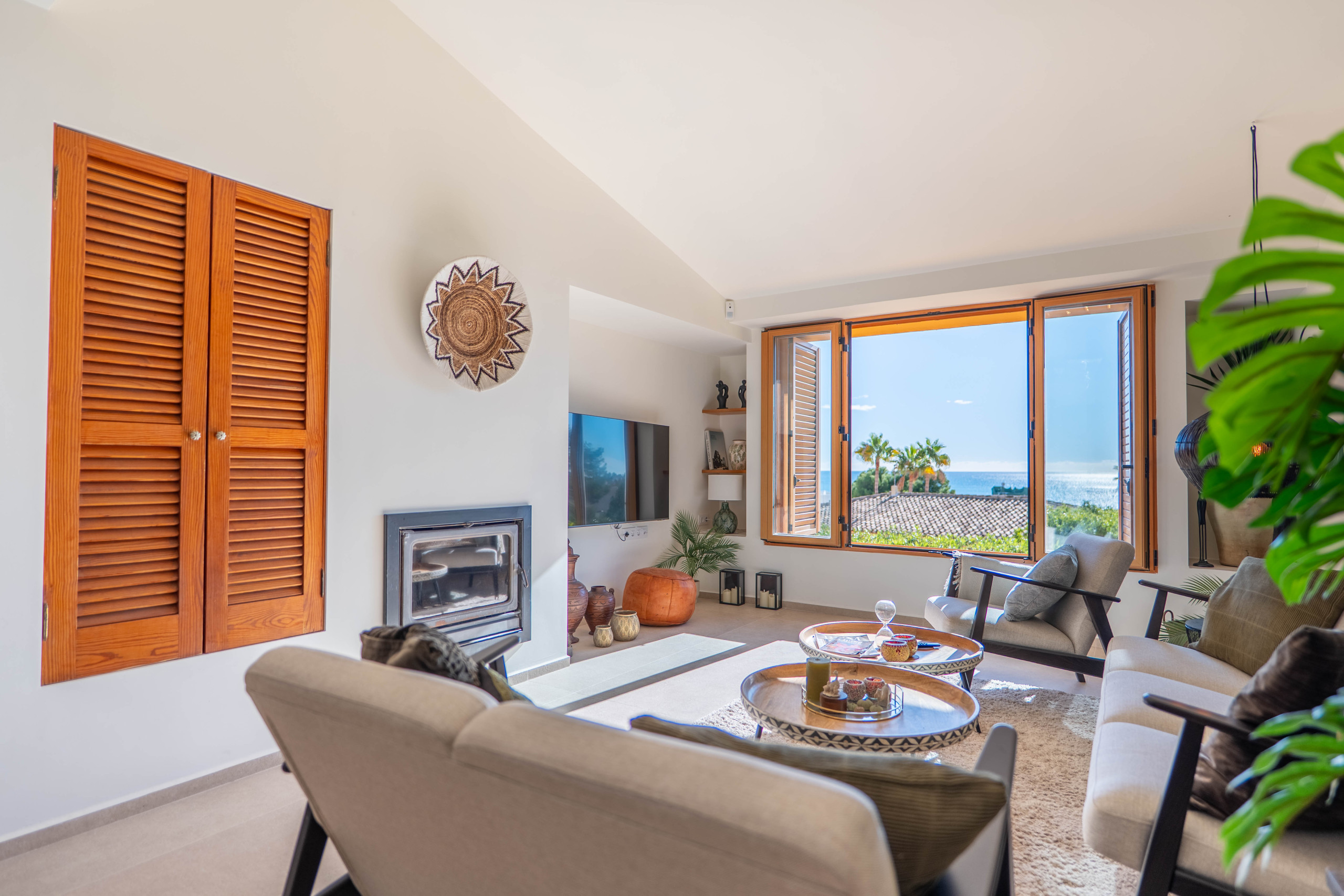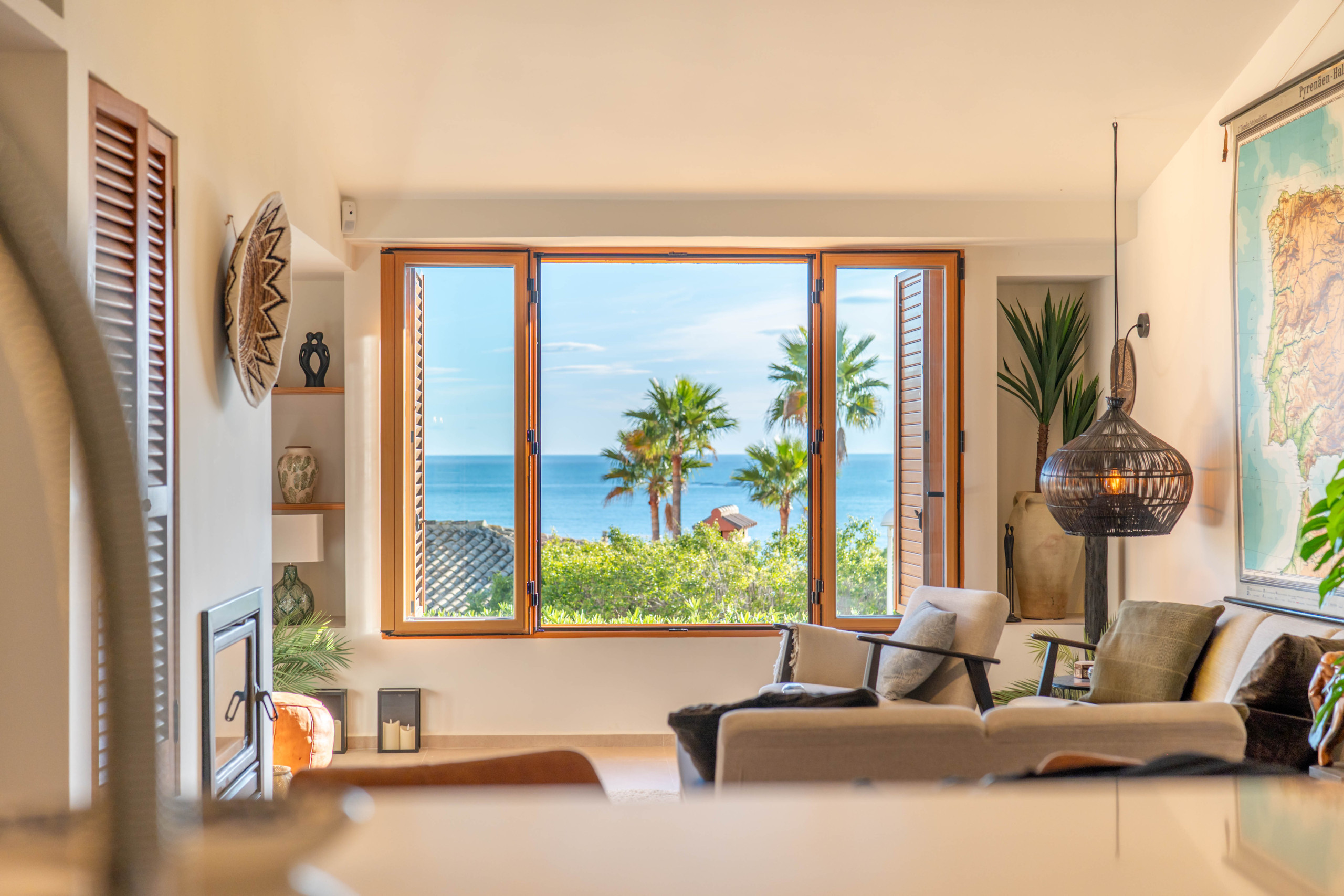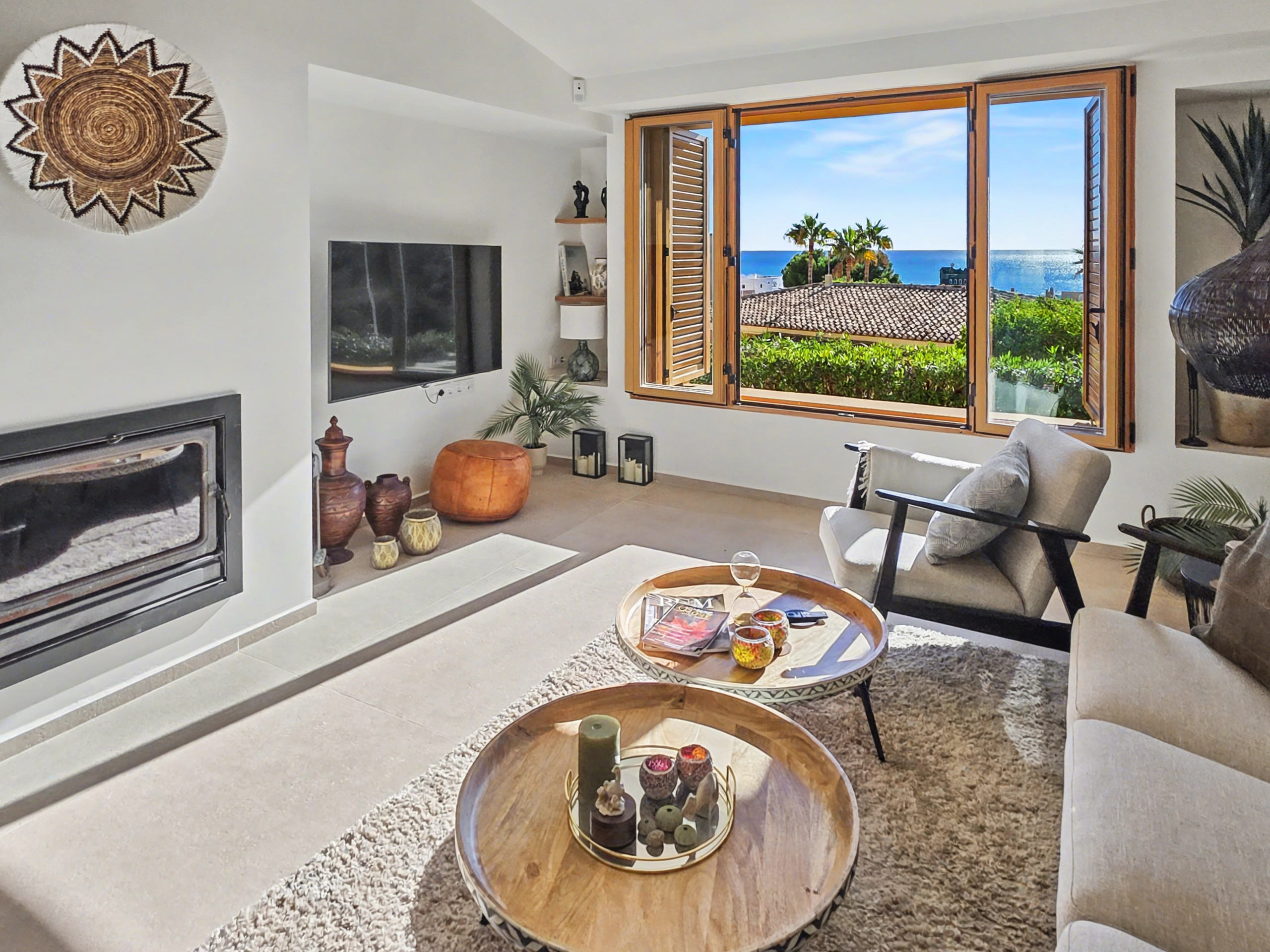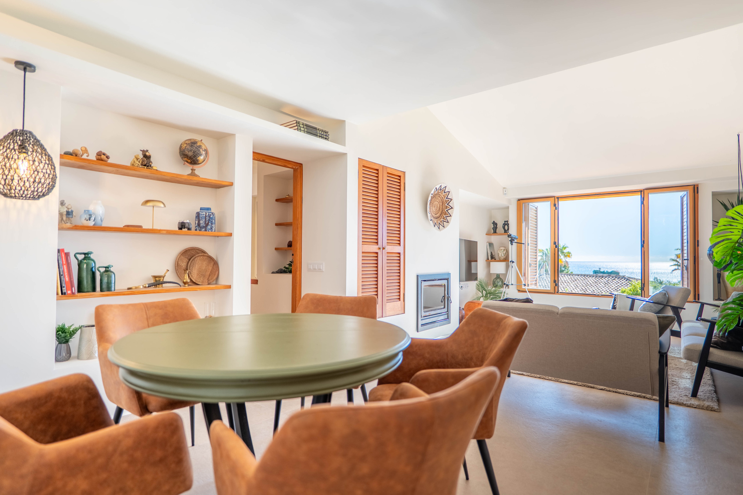 Espacios comunes: Un salón acogedor con chimenea y grandes ventanales que integran el paisaje marino. Cuenta con un comedor luminoso conectado a una cocina funcional, que ofrece vistas al mar incluso mientras cocinas.