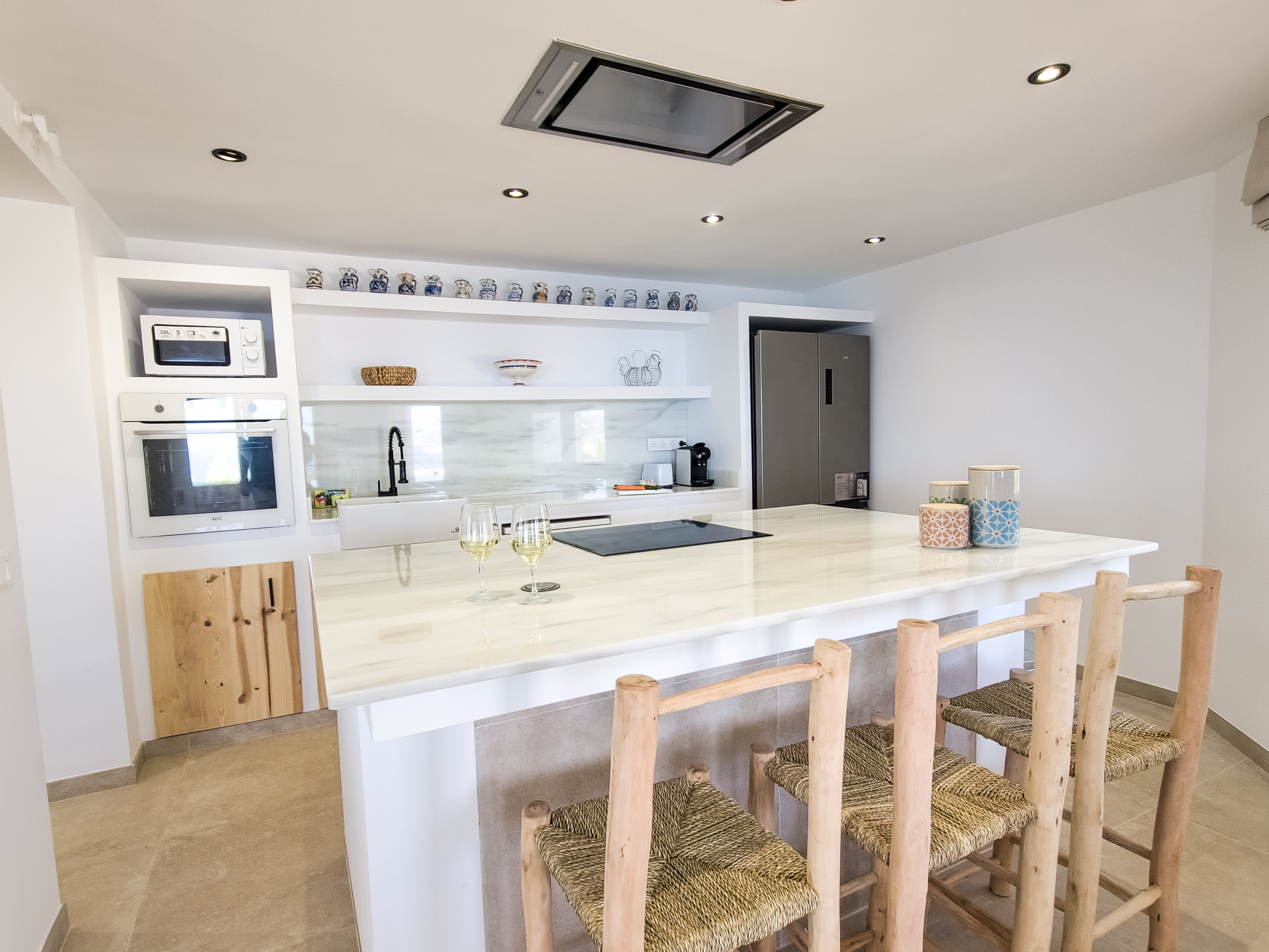 La villa consta de 3 dormitorios (1 de ellos con cama de matrimonio, Kingsize y 2 con dos camas individuales, en uno de ellos las dos camas de 90 están juntas), 2 baños con ducha, 1 aseo, salón comedor, cocina con isla, porche amplio con zona de comedor y de chill out. En esta misma planta, pero en el exterior, está la zona de piscina con una gran terraza y hamacas sobrevolando el mar. Además, la villa cuenta con aire acondicionado frío/calor por conductos de la marca Mitsubishi, así como ventiladores modernos de techo con mando a distancia.