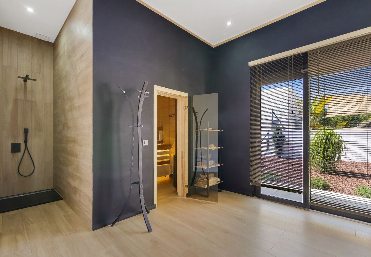 Die Villa erstreckt sich bequem auf einer Ebene und bietet 4 Schlafzimmer, 3 Badezimmer, ein geräumiges und helles Wohn-Esszimmer, eine voll ausgestattete Küche mit Zugang zum Außenbereich, eine Sauna und viel Stauraum. Das Hauptschlafzimmer hat Zugang zu einer Terrasse mit teilweisem Meerblick.
