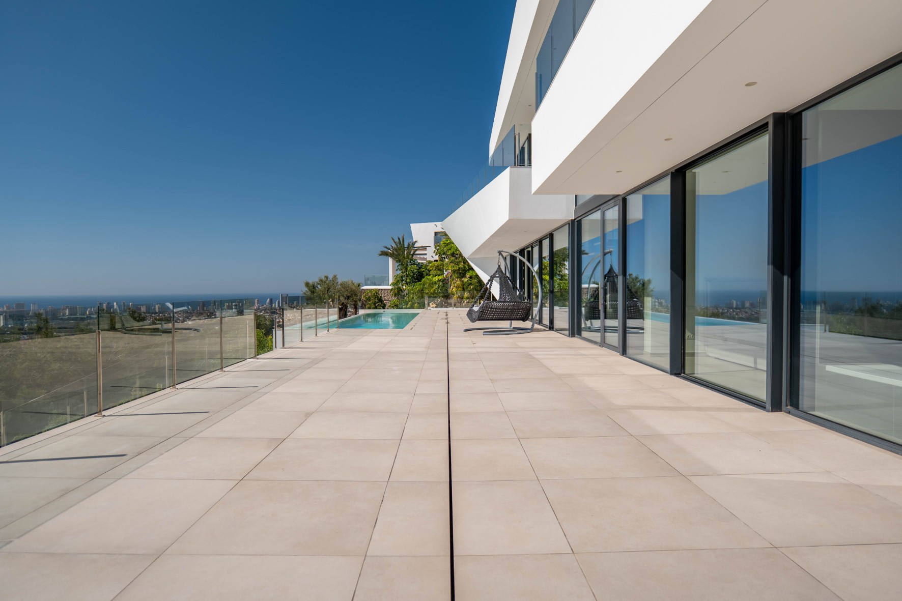 Das Erdgeschoss verfügt über ein geräumiges Wohn-Esszimmer, eine moderne Küche, ein Gäste-WC und ein Hauptschlafzimmer mit begehbarem Kleiderschrank und eigenem Bad, alles mit direktem Zugang zur Terrasse und zum Pool. Der Pool, über 15 Meter lang und mit Infinity-Rand, ist perfekt, um das mediterrane Klima zu genießen.