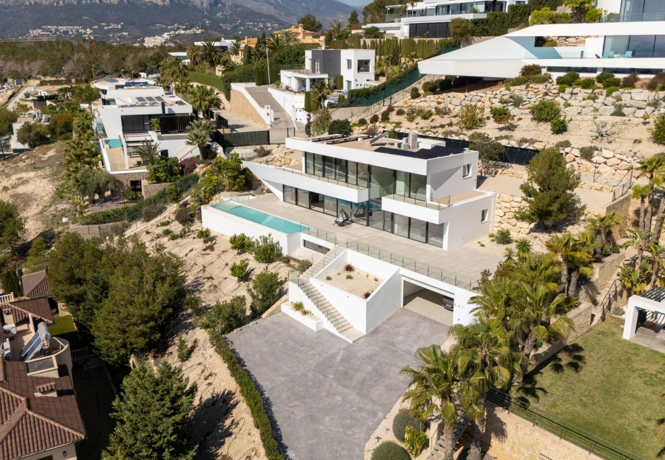 Neue und moderne Villa zum Verkauf in Calpe und Benissa auf einem großen Grundstück mit atemberaubendem Panoramablick auf das Meer und den Peñón de Ifach.