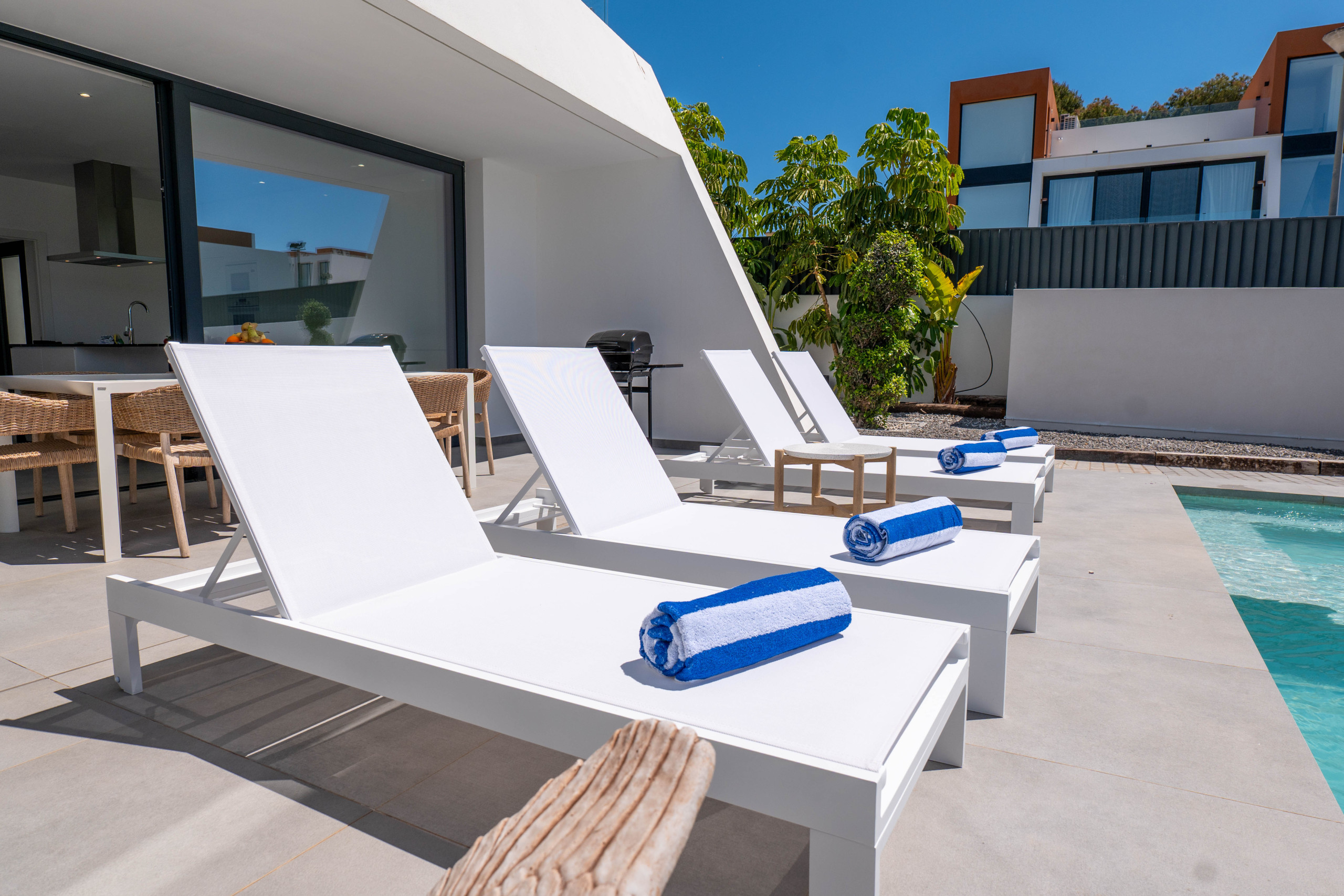 Das Innere der Villa ist ein Spiegelbild von Eleganz und Helligkeit, mit großzügigen Räumen, die mühelos ineinander übergehen. Die Villa wird komplett mit neuen, eleganten Qualitätsmöbeln verkauft. In der oberen Etage bieten drei Schlafzimmer mit Badezimmern en suite einen Zufluchtsort der Privatsphäre und des Komforts, alle mit Zugang zur charmanten Terrasse.