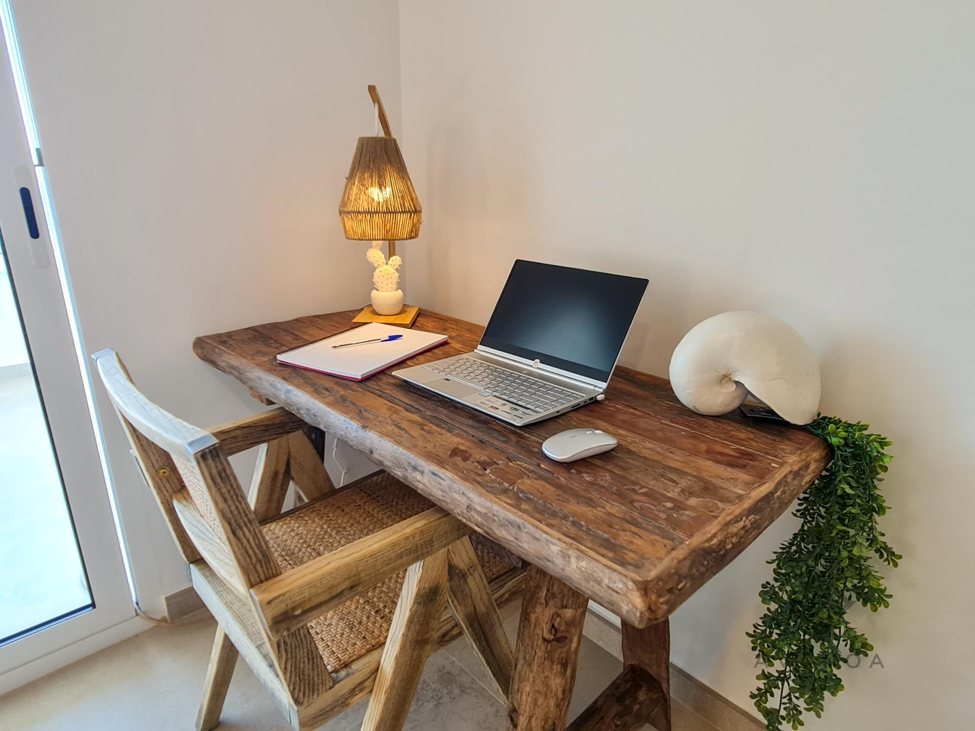 Die Wohnung verfügt über ein geräumiges Wohn-Esszimmer mit direktem Zugang zur Terrasse, ein perfekter Raum zum Entspannen im Freien mit Blick auf das Mittelmeer. Die Küche ist separat und komplett ausgestattet mit Backofen, Glaskeramikkochfeld, Mikrowelle, Kühlschrank, Kaffeemaschine, Toaster, Wasserkocher und allem notwendigen Küchenequipment.