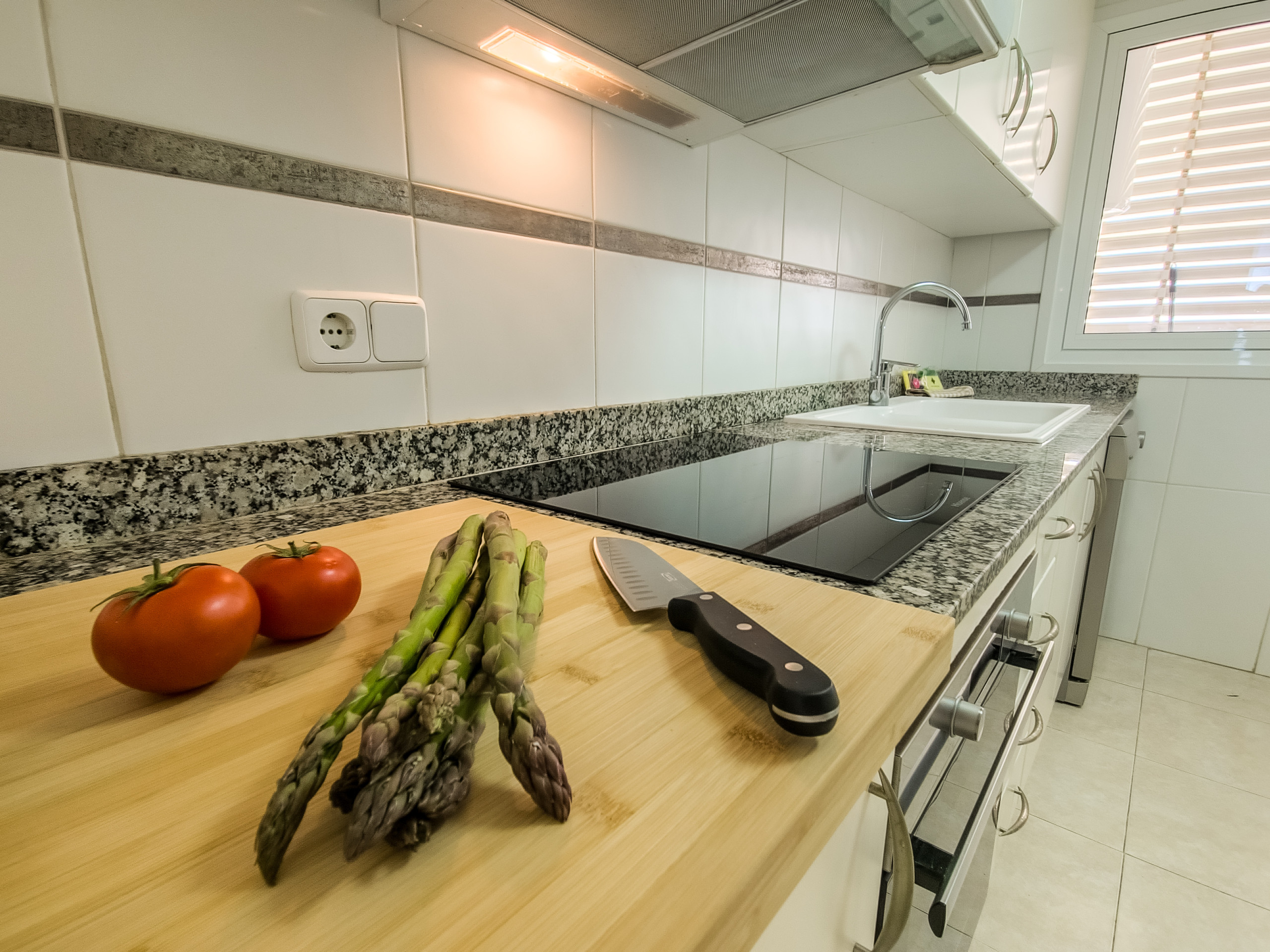 Die Wohnung verfügt über drei Schlafzimmer: zwei mit Doppelbetten und eines mit zwei Einzelbetten. Das Hauptschlafzimmer hat ein eigenes Badezimmer mit Badewanne, während das zweite Badezimmer mit einer modernen Dusche ausgestattet ist. Die Küche ist komplett mit neuen Geräten ausgestattet und es gibt einen praktischen Hauswirtschaftsraum.