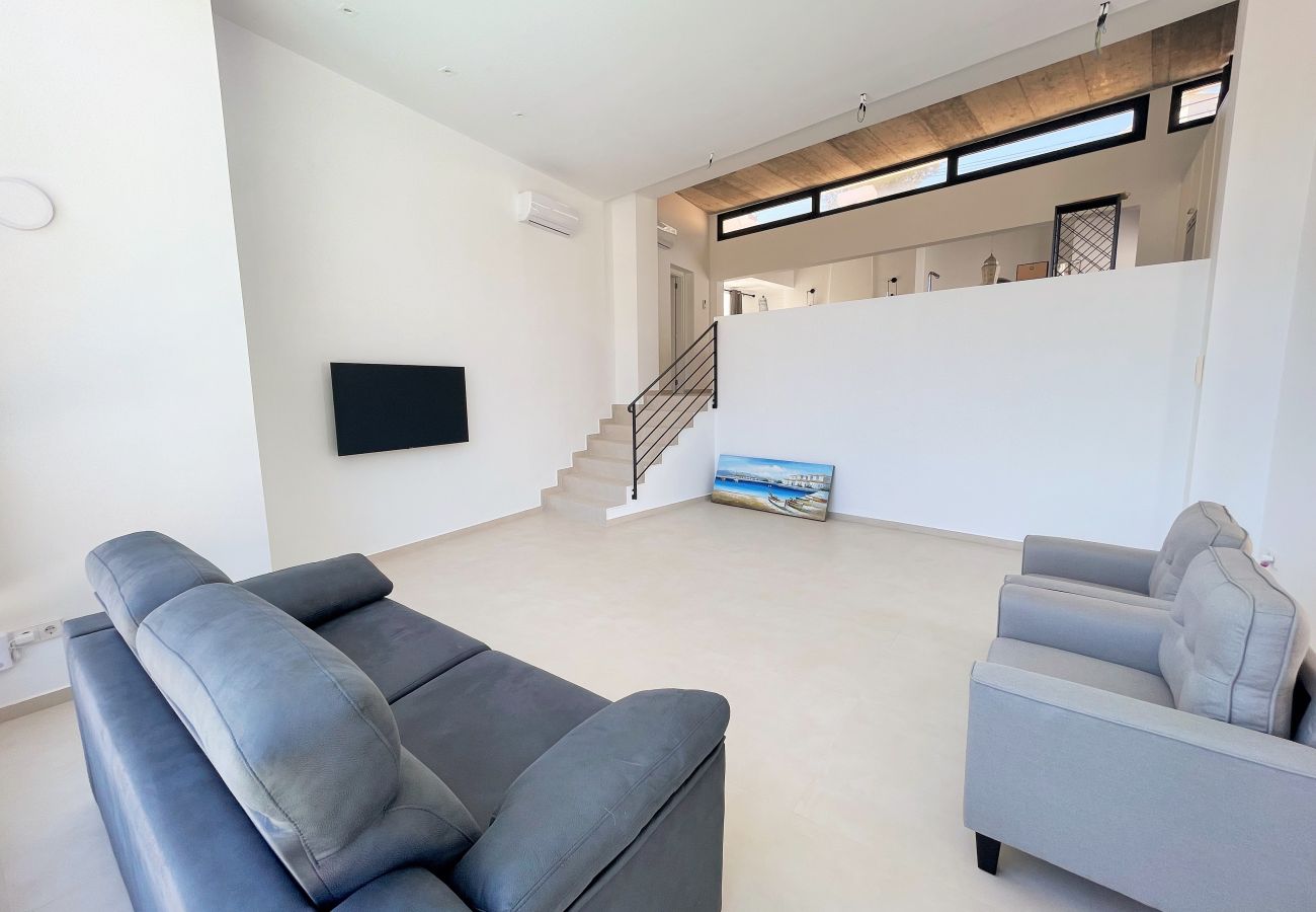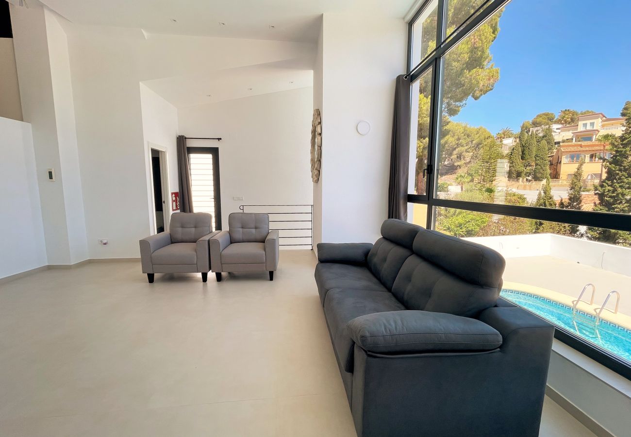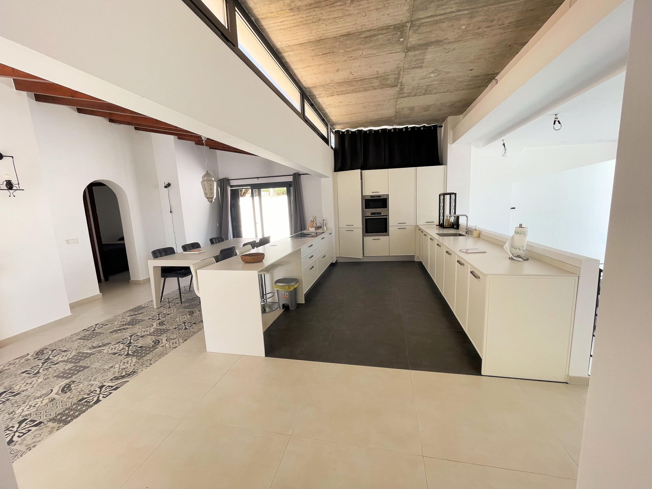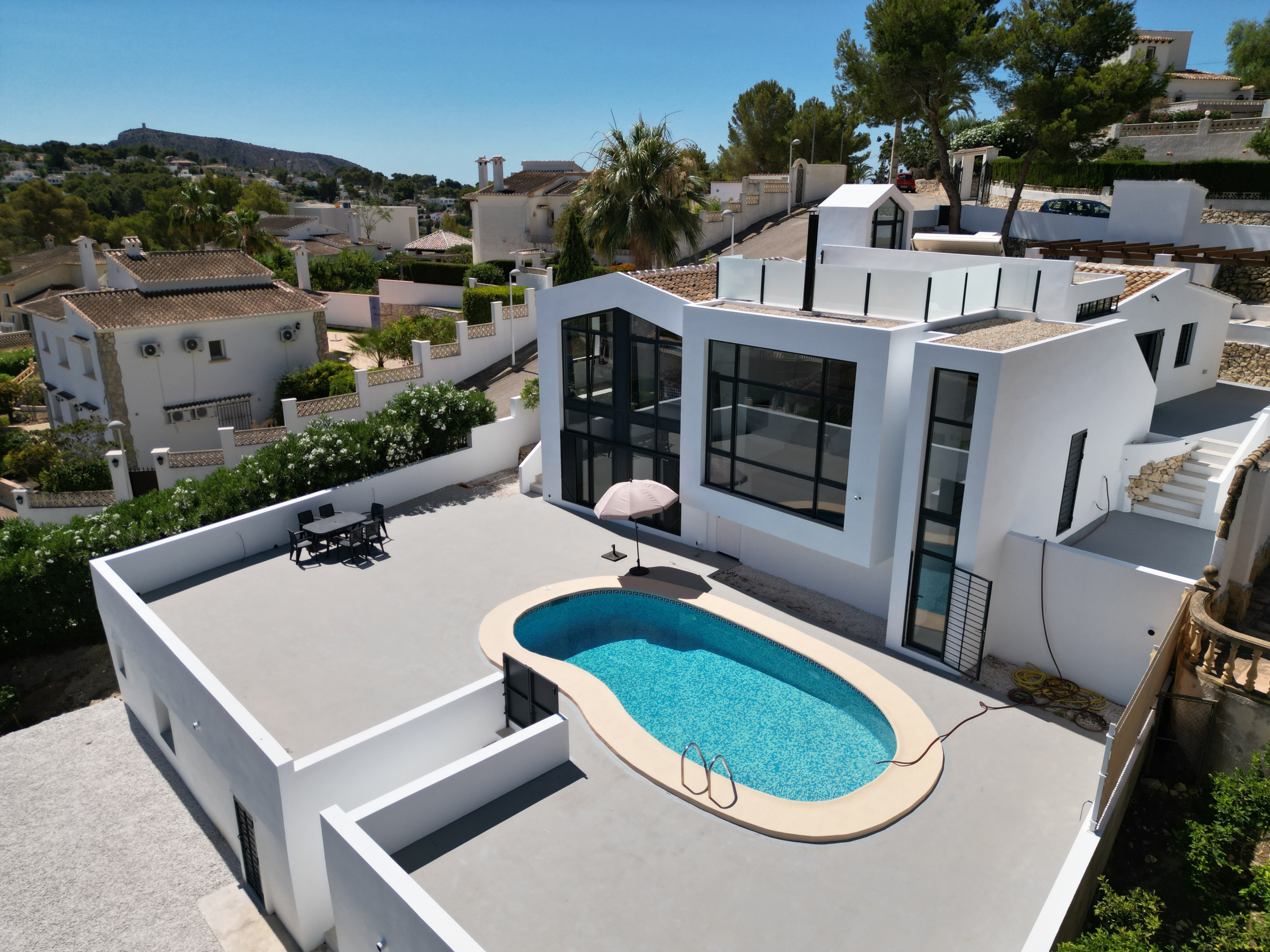 This fantastic modern villa, the result of a complete renovation and extension, blends traditional and modern styles seamlessly. Its award-winning exterior design makes it visually appealing. The main floor features a hall that opens into an open kitchen, alongside a side dining room and living room on the same level. This floor also hosts 4 bedrooms, two en suite and one with a side dressing room. Only a few steps separate the kitchen level from the living room. There is also a guest toilet next to the stairs leading to the pool. At the pool level, there's an independent studio with a shower and a bedroom. The house has a basement with a shower, perfect for use as a gym. Additionally, there is a solarium terrace and a 27 m² pool. The property includes air conditioning, a fireplace, and solar panels. Located in the Tabaira area, it's a short walk to the town of Moraira and all amenities.