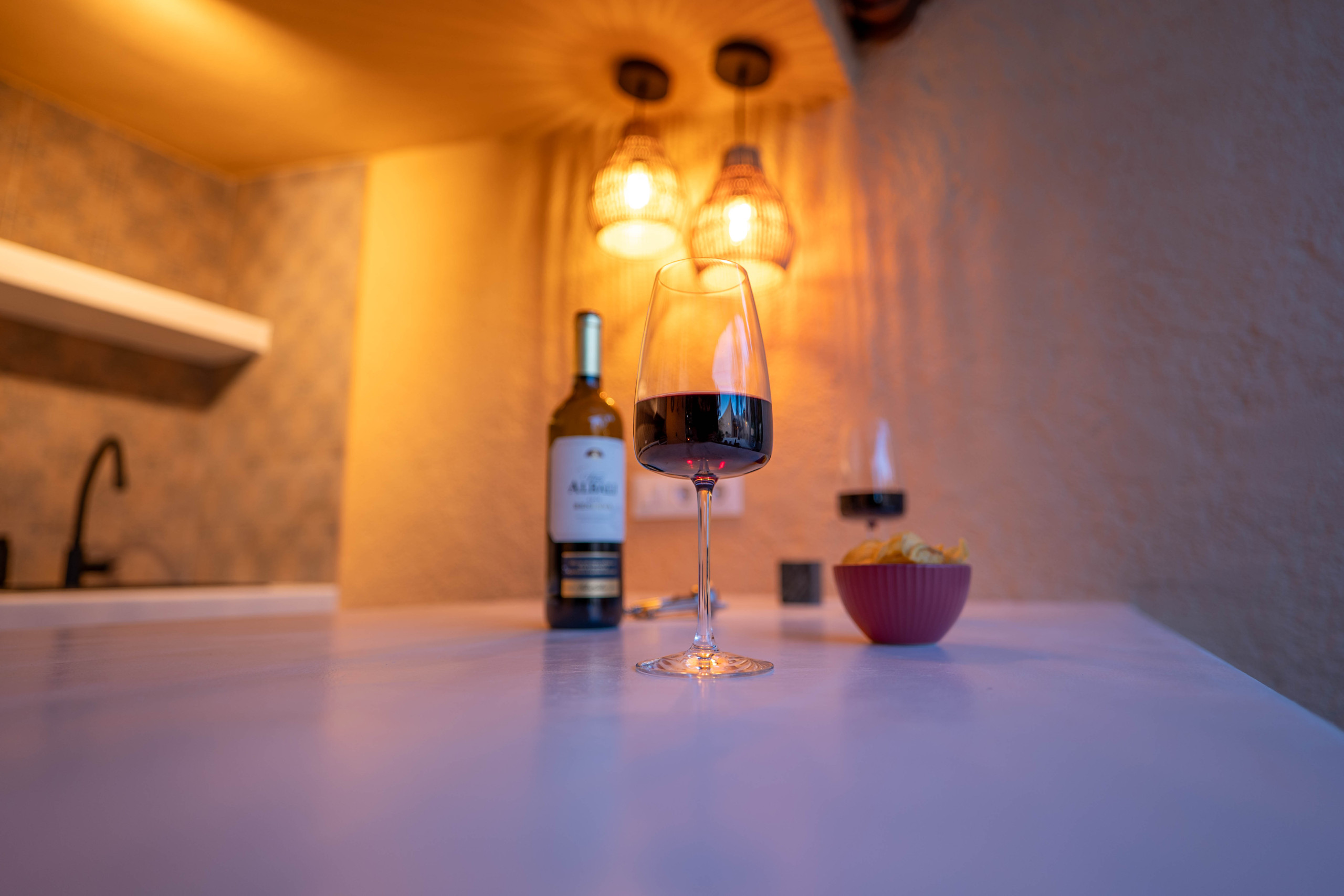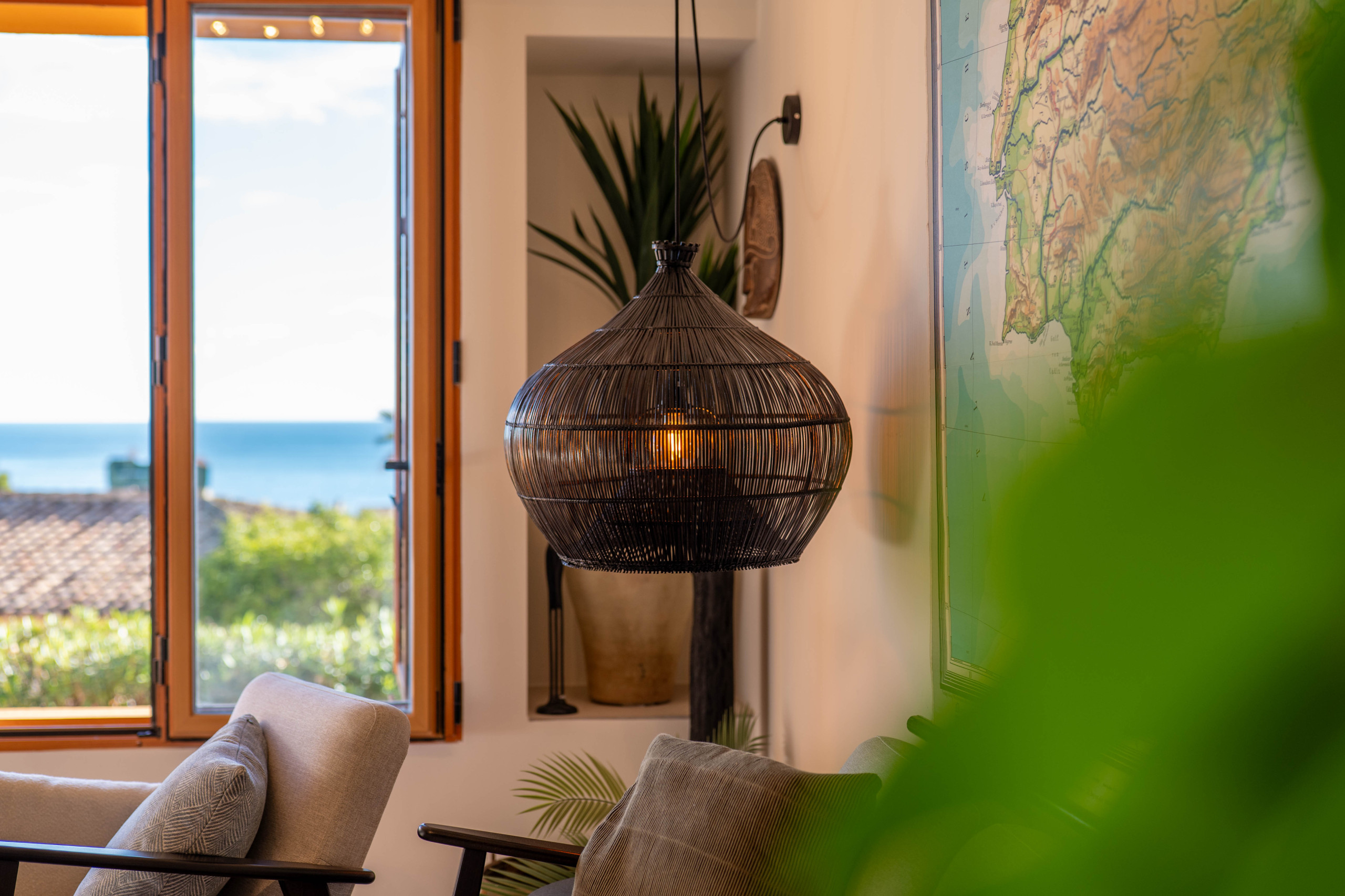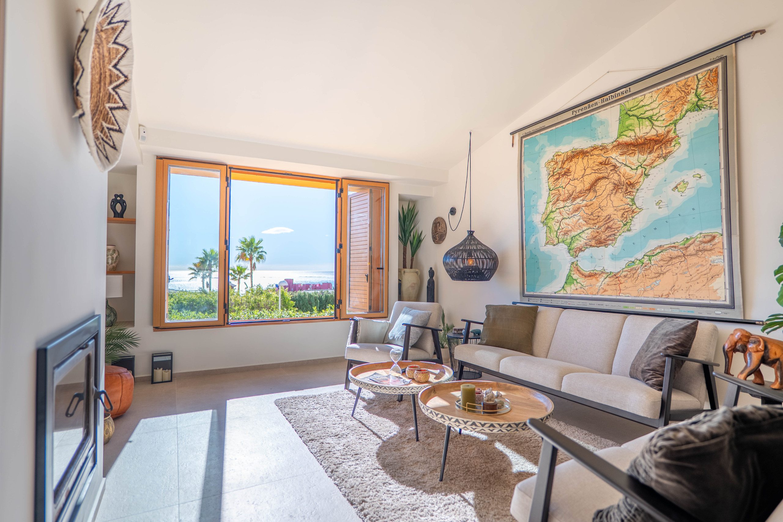 Espaces communs : Un salon accueillant avec cheminée et grandes baies vitrées qui intègrent le paysage marin. Il dispose d'une salle à manger lumineuse connectée à une cuisine fonctionnelle, offrant une vue sur la mer même pendant la préparation des repas.