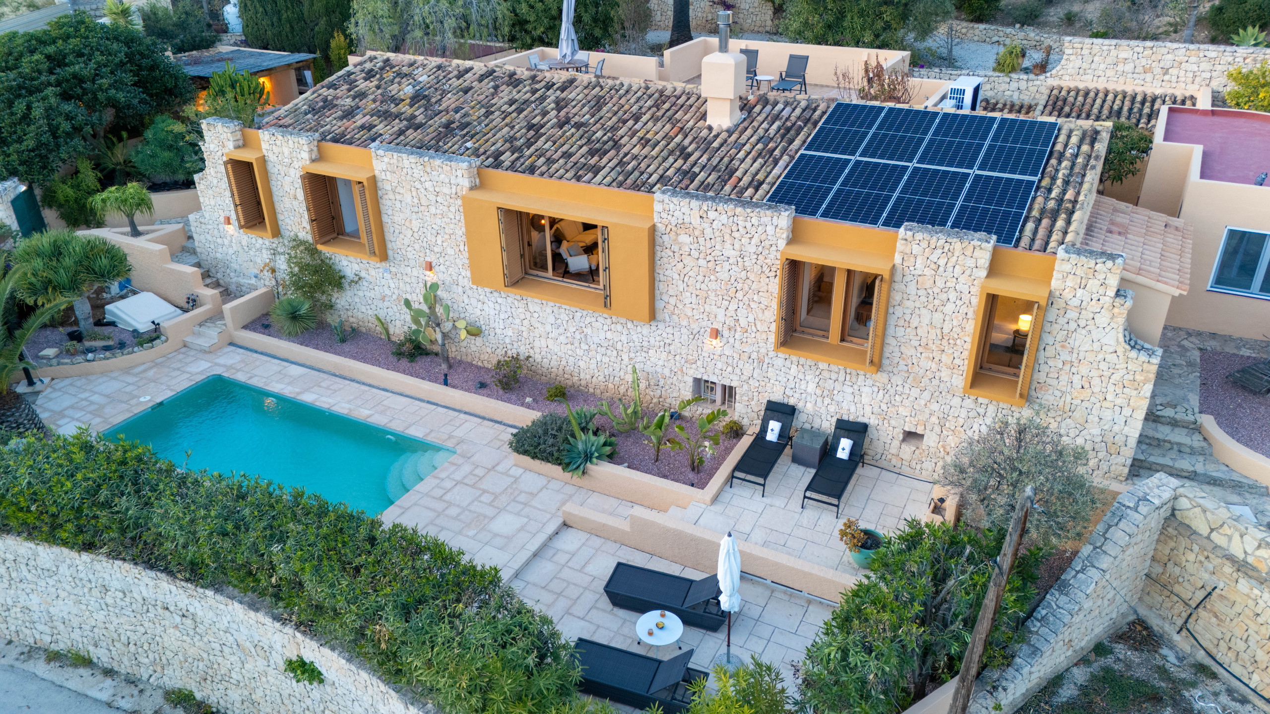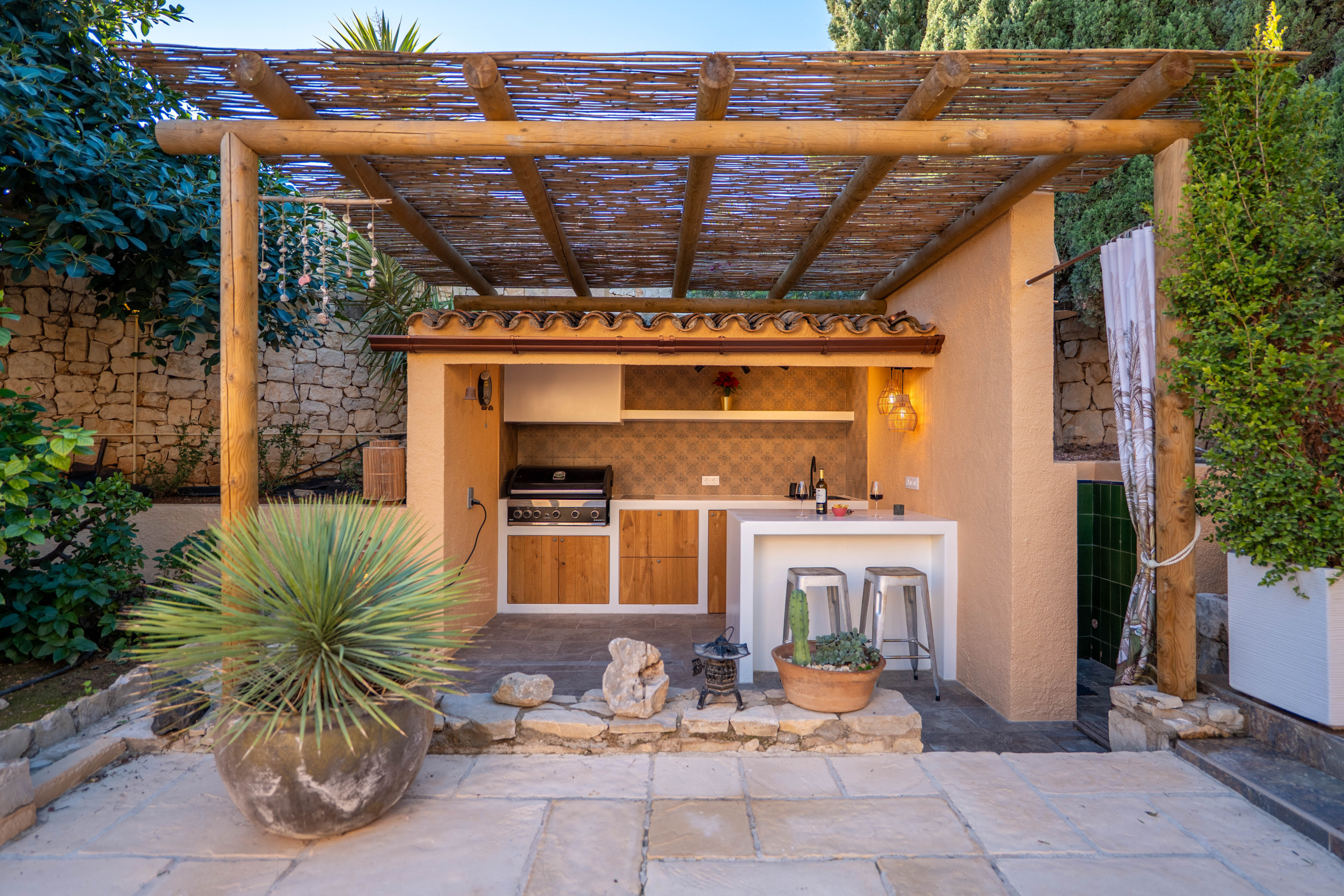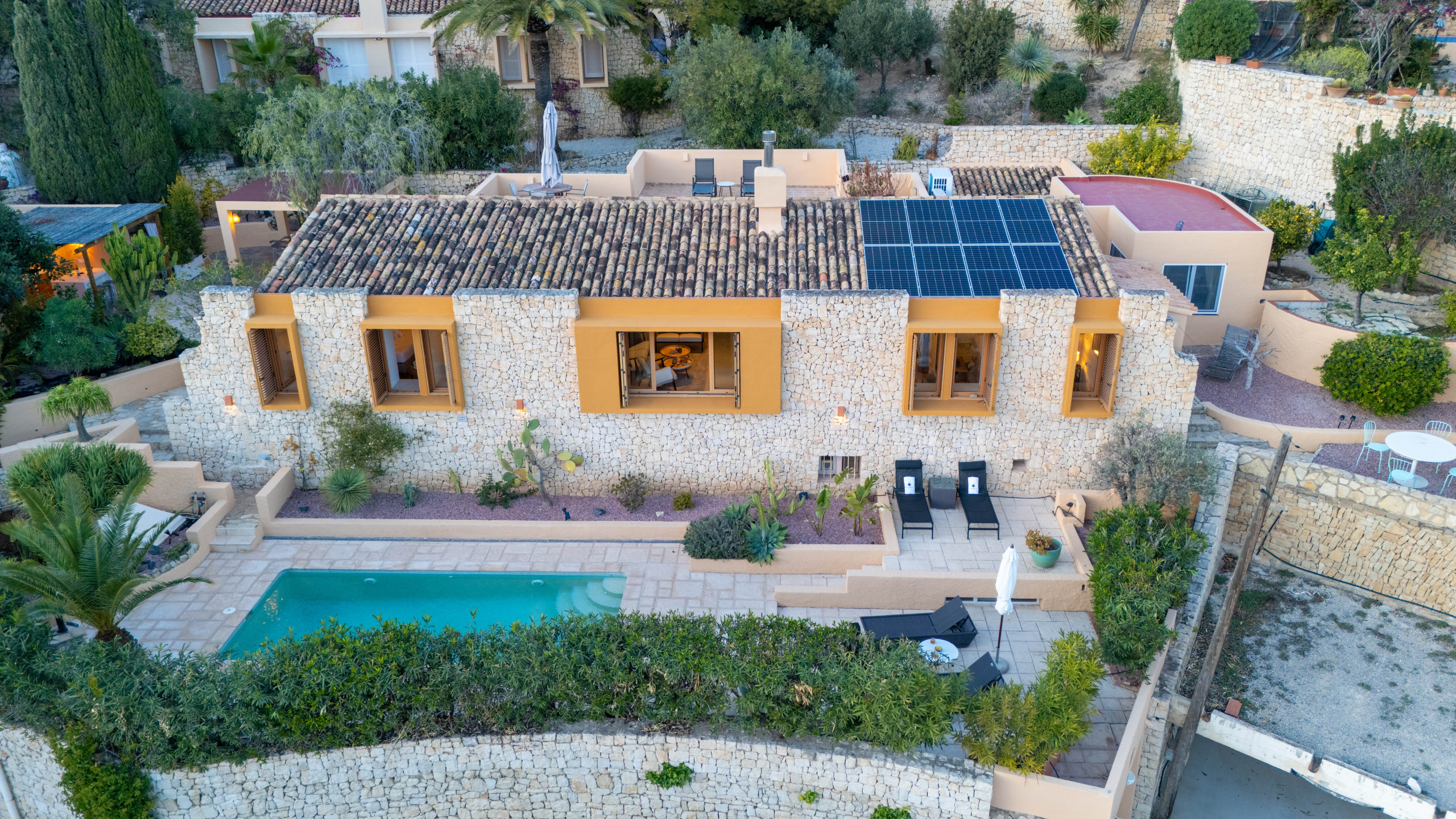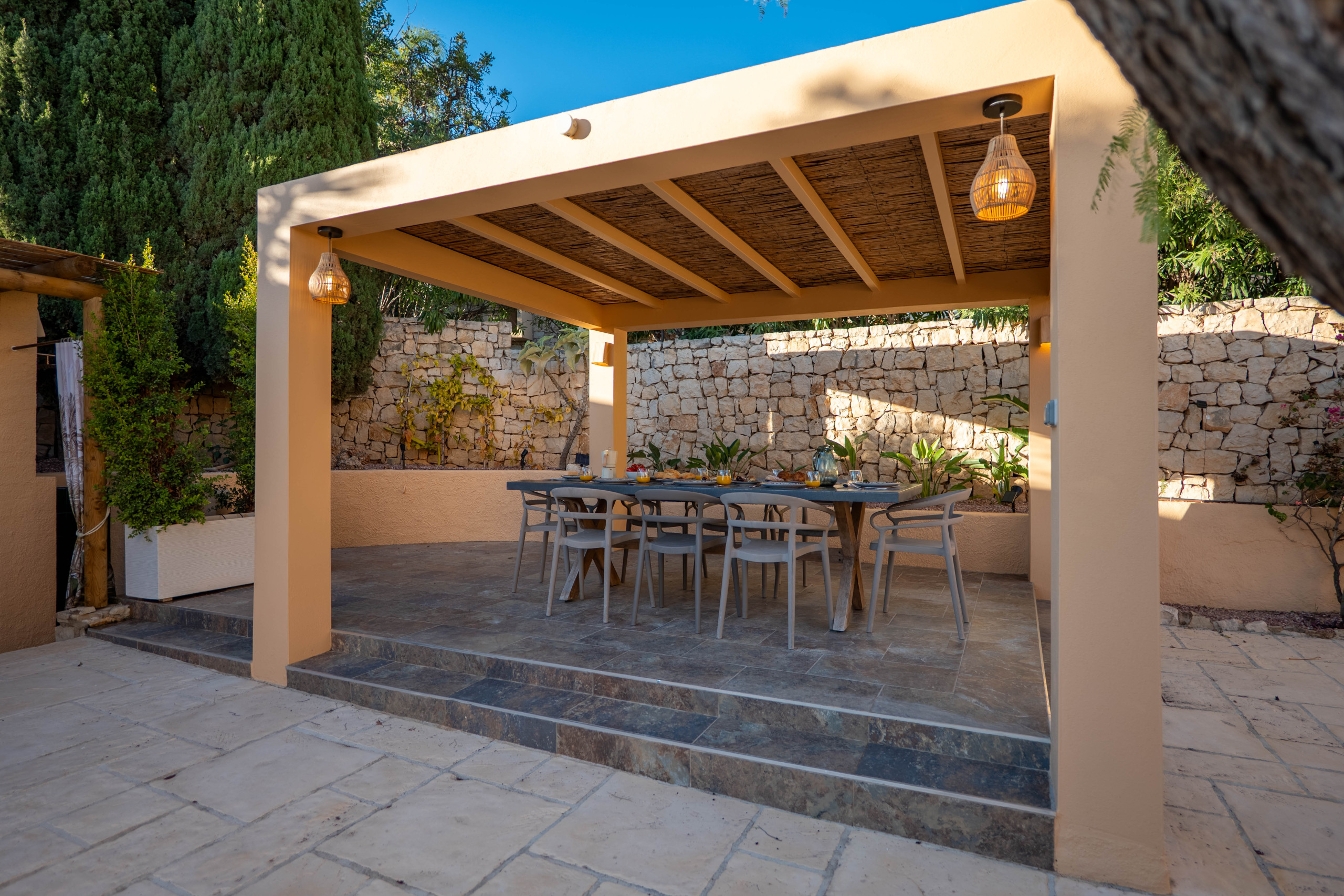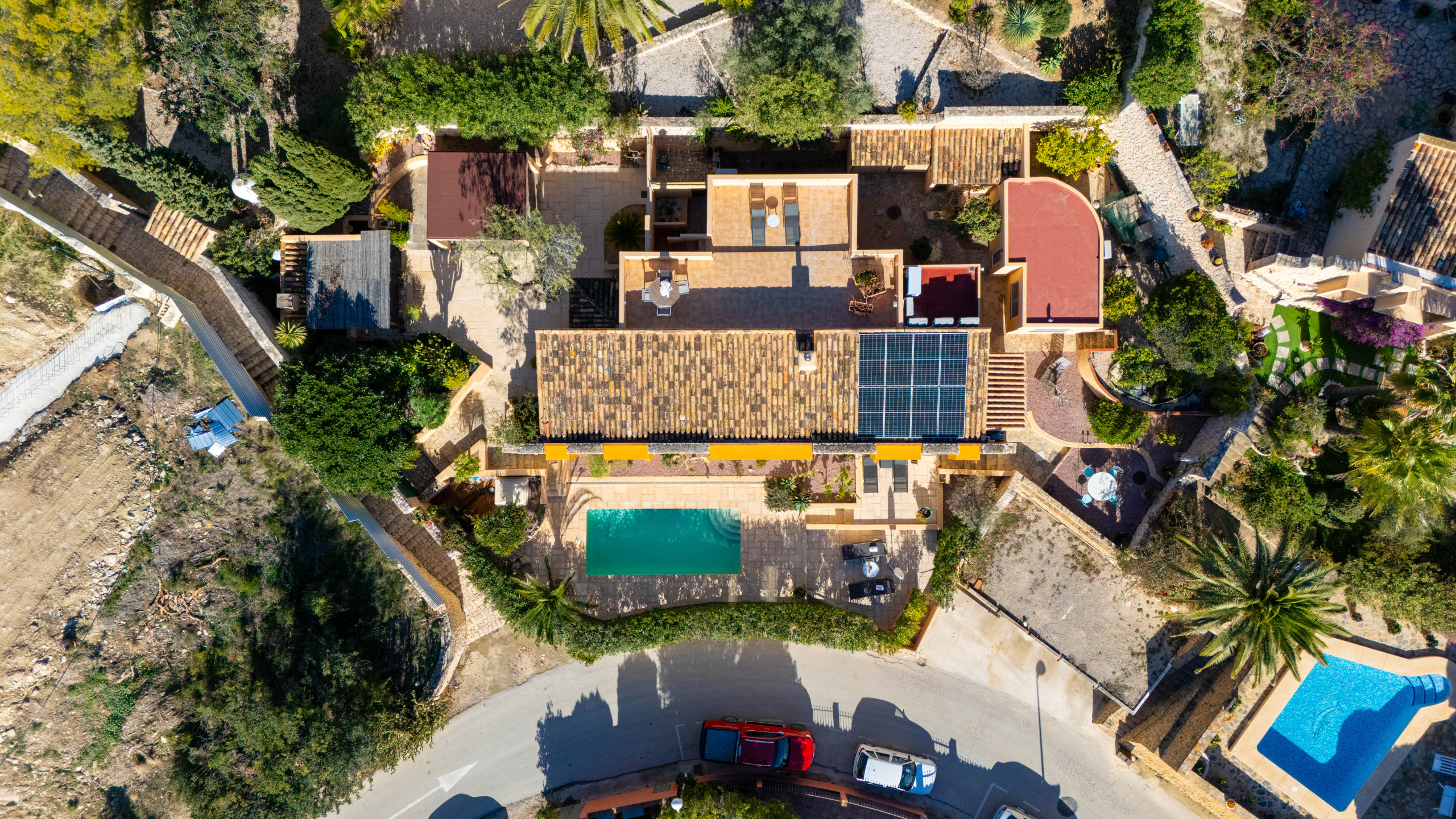 L'Extérieur : Votre belvédère privé sur la Méditerranée. La vie dans cette villa tourne autour de son fabuleux espace extérieur. Entourée de végétation et offrant une totale intimité, la zone de piscine devient le cœur de la maison. Profitez de dîners inoubliables sous la pergola couverte, équipée d'une zone de barbecue complète (plancha à gaz, réfrigérateur et bar), tout en contemplant les silhouettes iconiques de La Muralla Roja et le Xanadú, classés comme Bien d'Intérêt Culturel.