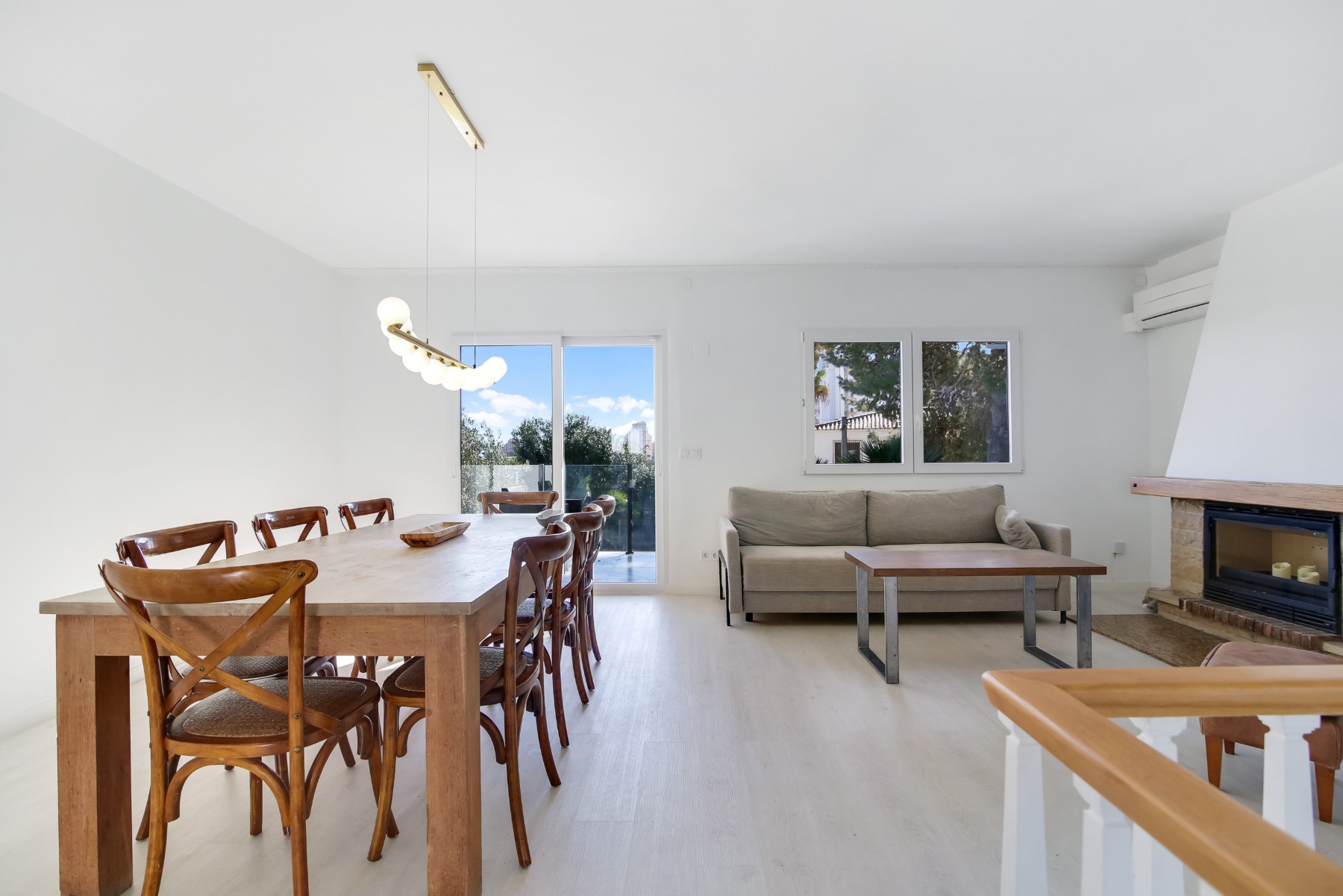Au rez-de-chaussée, nous trouvons un grand salon-salle à manger lumineux avec une cheminée, connecté à une cuisine moderne entièrement équipée.