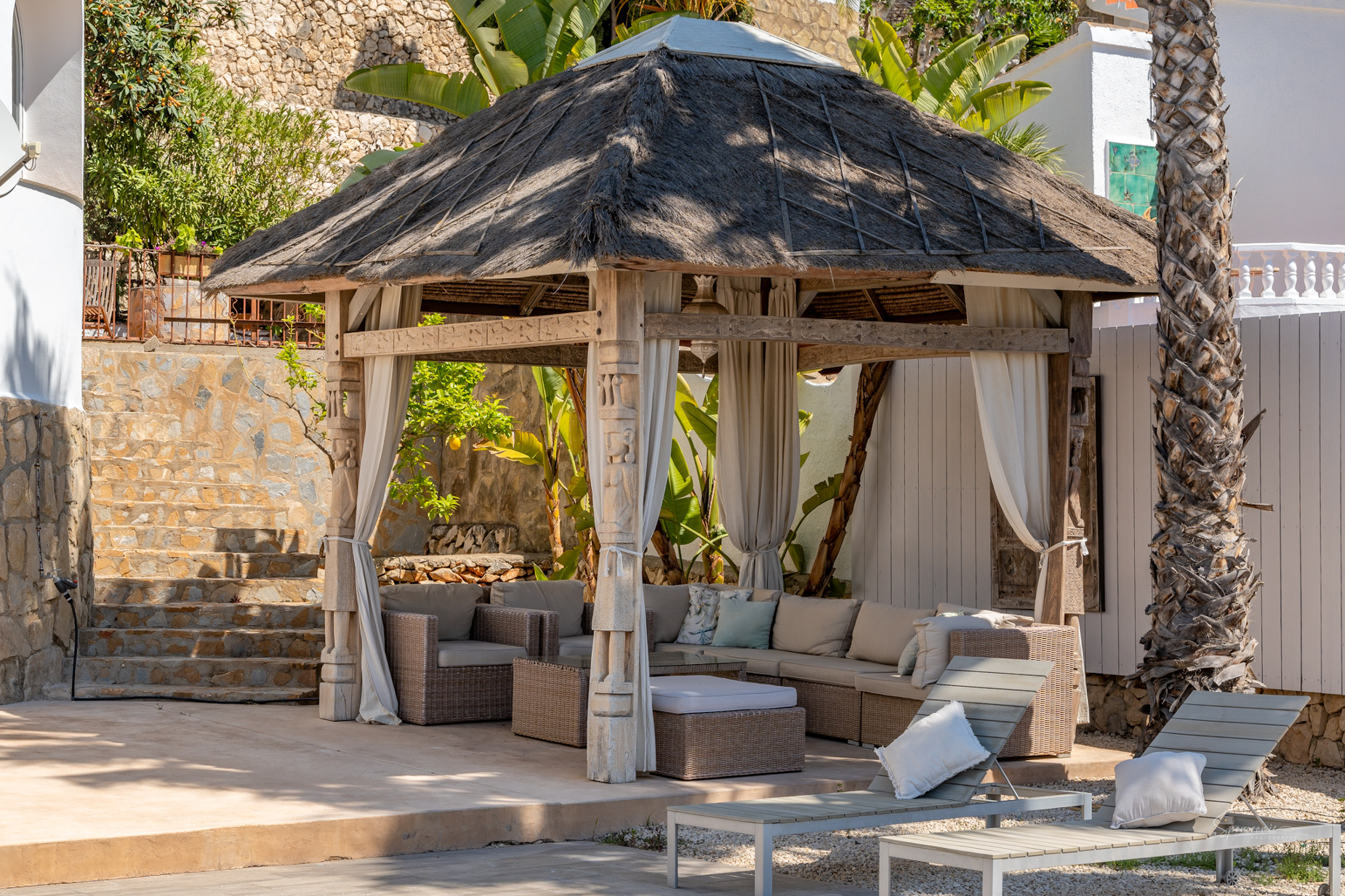 En el exterior, la villa cuenta con una piscina moderna rodeada de una amplia terraza para tomar el sol, además de una zona chill-out al estilo cabana. Al otro lado de la villa, encontrarás un patio con un área de comedor al aire libre y vistas despejadas, todo rodeado de jardines de bajo mantenimiento.
