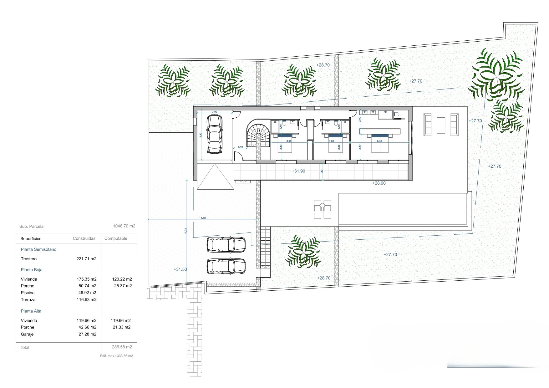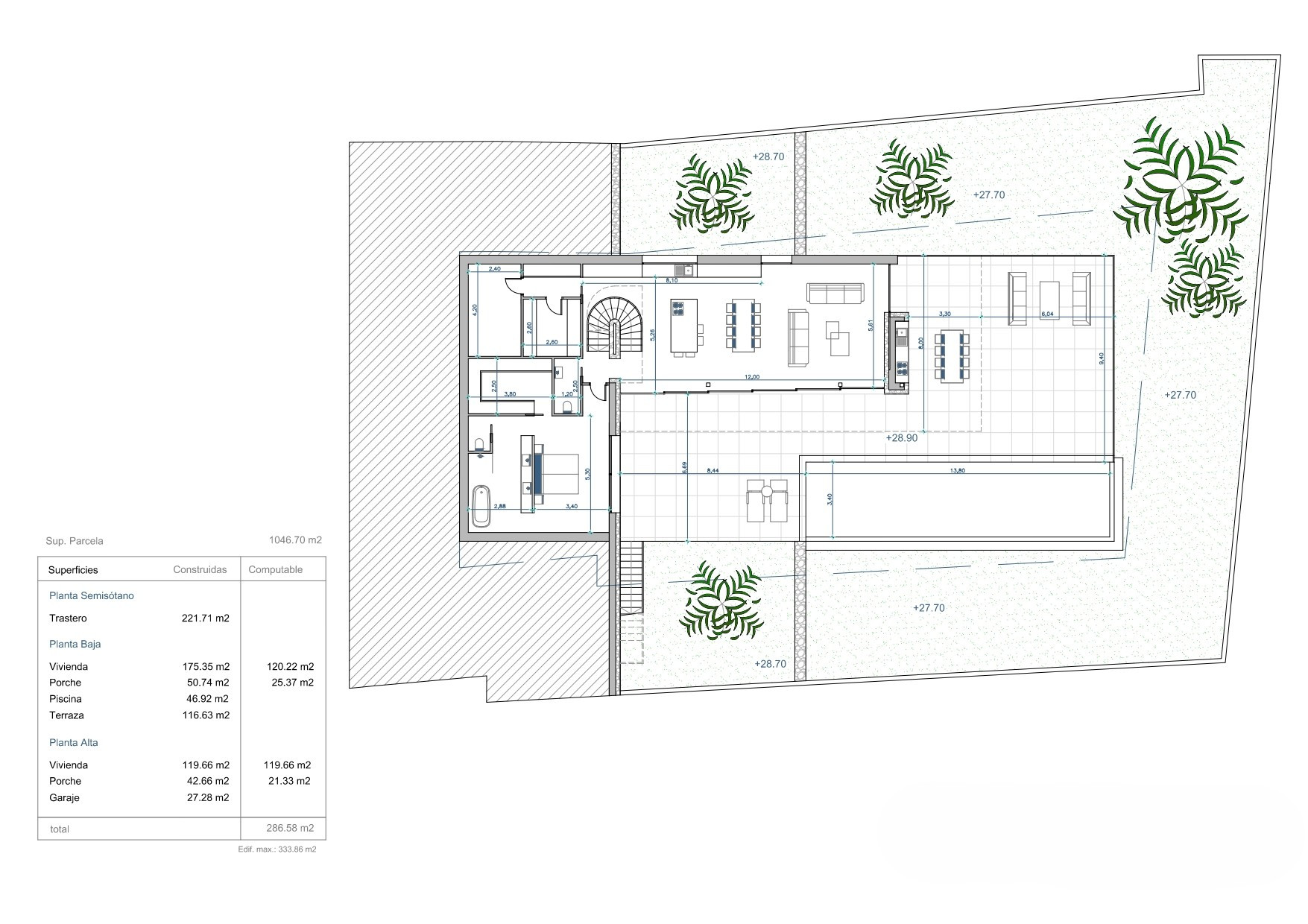Planta sótano: generoso trastero de 221 m², proporcionando un espacio versátil y práctico para almacenamiento o uso adicional según sus necesidades.